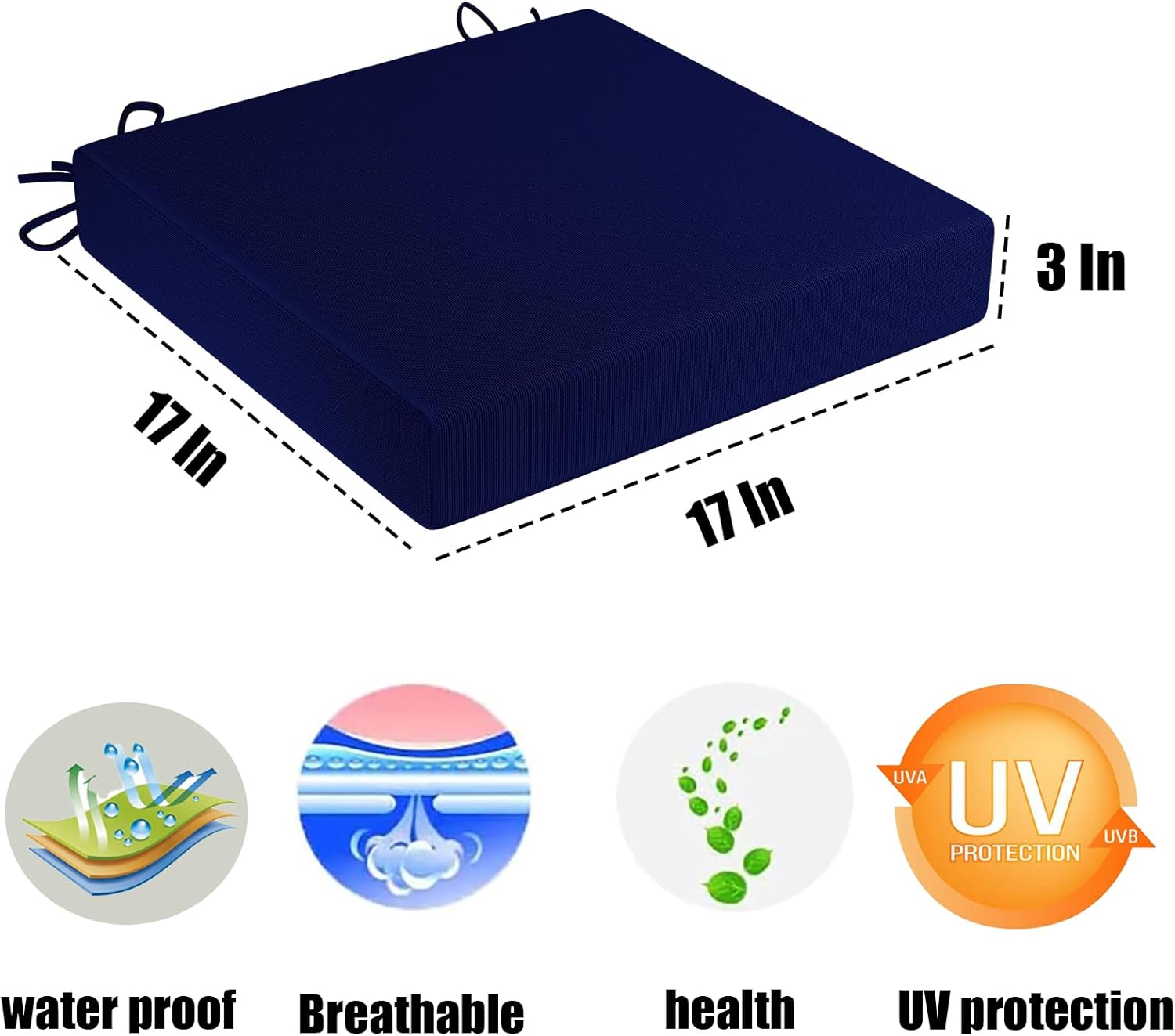 💦UNIVERSAL FIT FOR MOST CHAIRS: cushions for outdoor furniture17 x 17 x 3 Inch are designed to fit most chairs, making them the perfect addition to any outdoor seating area. and the size is a perfect fit for almost all outdoor chairs, including patio chairs, lawn chairs, rocking chairs, and beach chairs. The cushion also has four ties that can be used to securely fasten it to the chair.