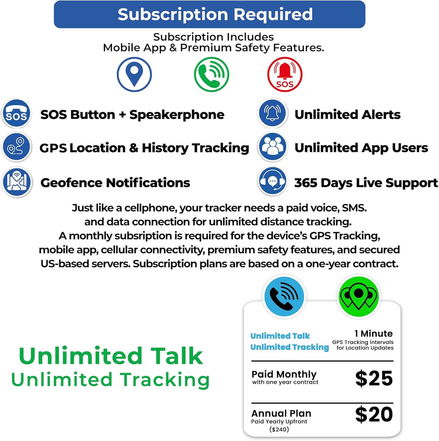 MONTHLY SUBSCRIPTION REQUIRED: Just like a cellphone, your tracker needs a paid voice, SMS, and data connection for unlimited distance tracking. A monthly subscription is required for the device’s GPS Tracking, mobile app, cellular connectivity, and all premium safety features, plus secured US-based servers. Subscription is $25 paid monthly with initial prepayment for 3 months ($75) at activation with one year contract, or $20/month with a 12 month prepayment of $240.
