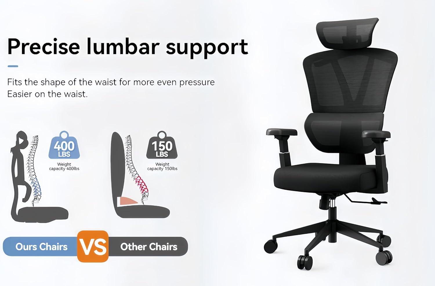 【ERGONOMIC OFFICE CHAIR WITH LUMBAR SUPPORT】: Designed as a back support office chair, our ergonomic mesh office chair features adjustable 3D lumbar support to reduce spine pressure. Perfect for big and tall office chair users seeking all-day comfort.