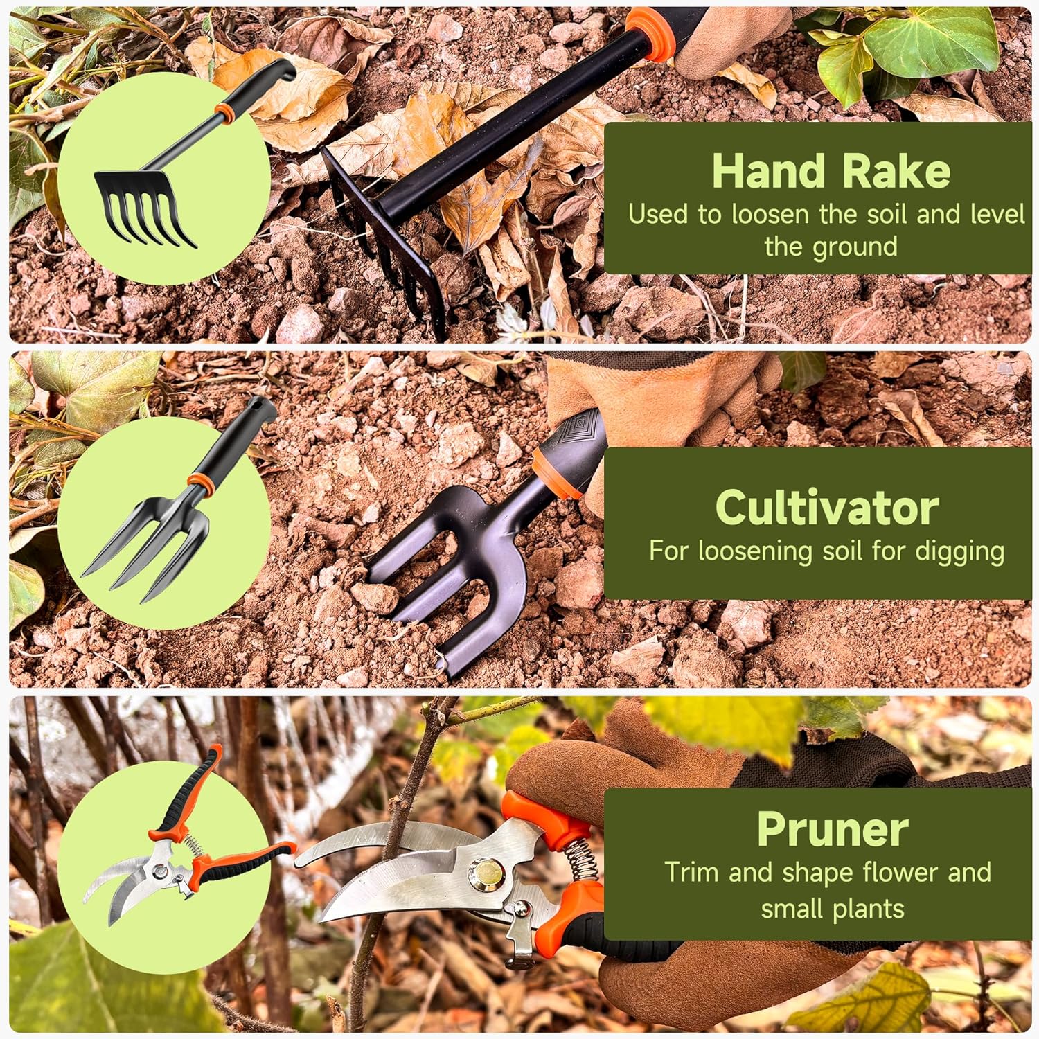 All-in-One Package: LEDERA garden tools set includes a total of 9 tools and 1 storage bag. Hand Rake, Cultivator, Pruner, Weeder, Small Trowel, Soil Scoop, Foldable watering bag, Garden Gloves, nearly everything you need in daily garden maintenance. The garden tools are sturdy and do well for basic tasks such as weeding, moving plants (digging up the root ball), digging/replanting, aerating, clipping, and so on.
