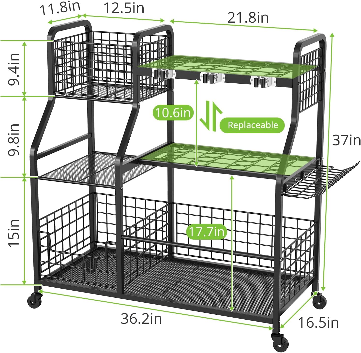 【Large Size】The overall length, width and height are: 36.2×16.5×37 inches, and the 3-tier large tool rack provides you with ample storage space. High load-bearing tool rack is perfect for your garden, yard, shed, garage, basement. The tool rack with wheels is a good helper for your indoor and outdoor storage.