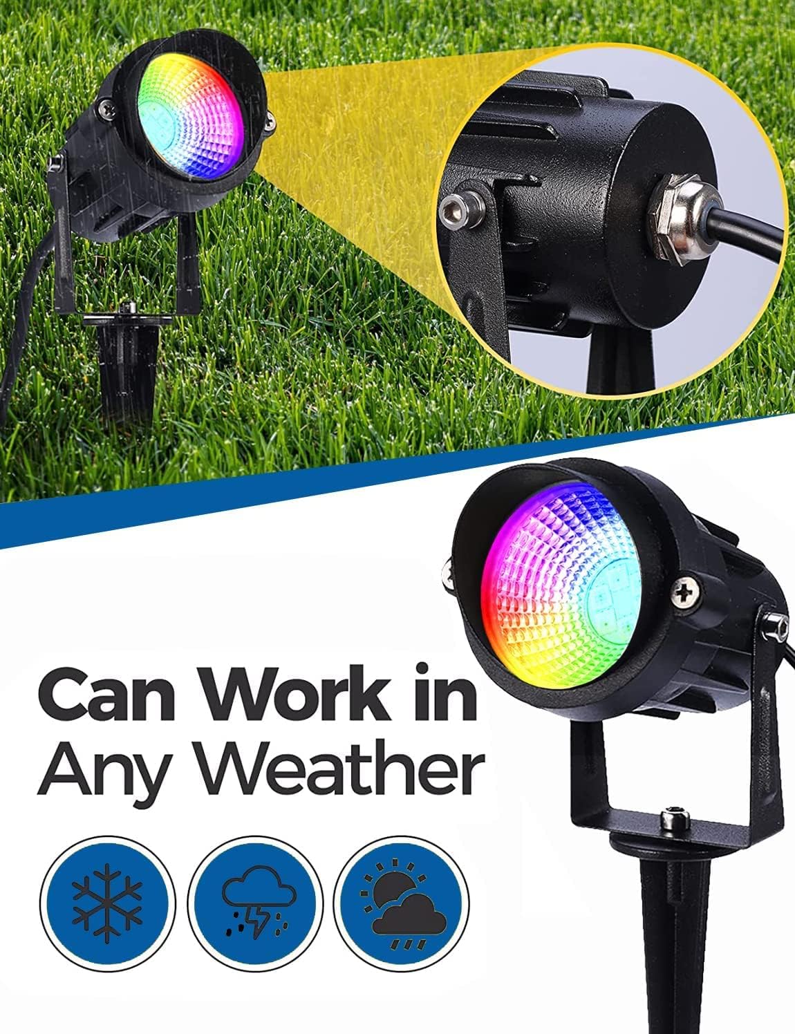 【Upgraded IP65 Waterproof RGB Landscape Lights】 Thick aluminum body and glass lens cover design withstand rainy and sy weather. IP65 waterproof structure greatly improves the durability of outdoor lighting and long-term use. The Fin-shaped metal body can effectively dissipate heat and prevent the lights from overheating after long time use, to prolong the service lifespan.