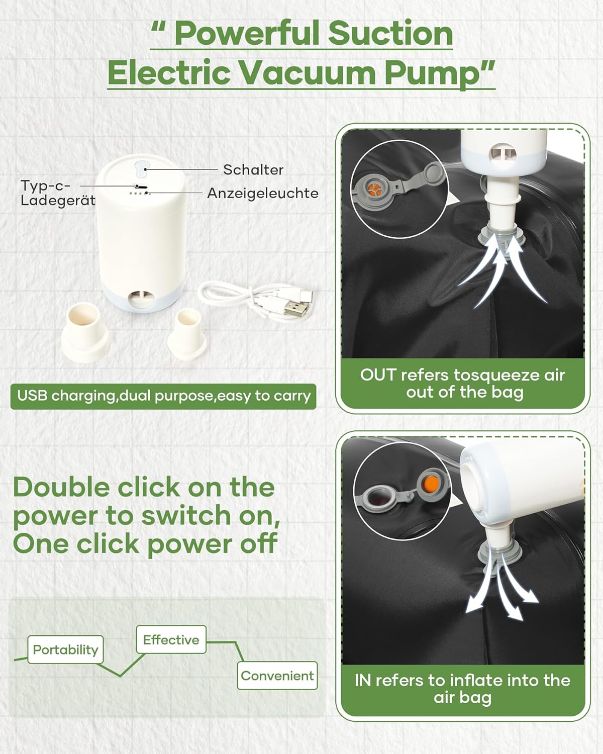Vacuum pump: The backpack comes with an electric vacuum pump, which comes with a charging cable and suction port accessories. Simply insert the electric pump into the valve of the vacuum bag and press the electric pump switch to quickly extract air.