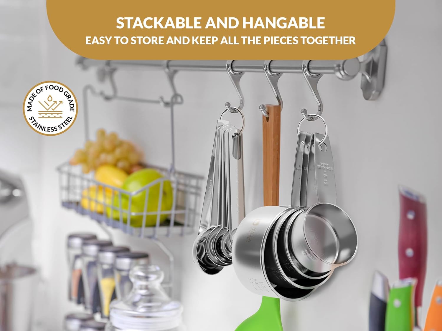 𝐒𝐭𝐚𝐜𝐤𝐚𝐛𝐥𝐞 & 𝐌𝐚𝐠𝐧𝐞𝐭𝐢𝐜: Includes 4 stackable measuring cups and 6 magnetic double-sided spoons that nest perfectly to save drawer space. Hangable and compact, this stainless steel measuring cup set keeps your kitchen clean and organized.