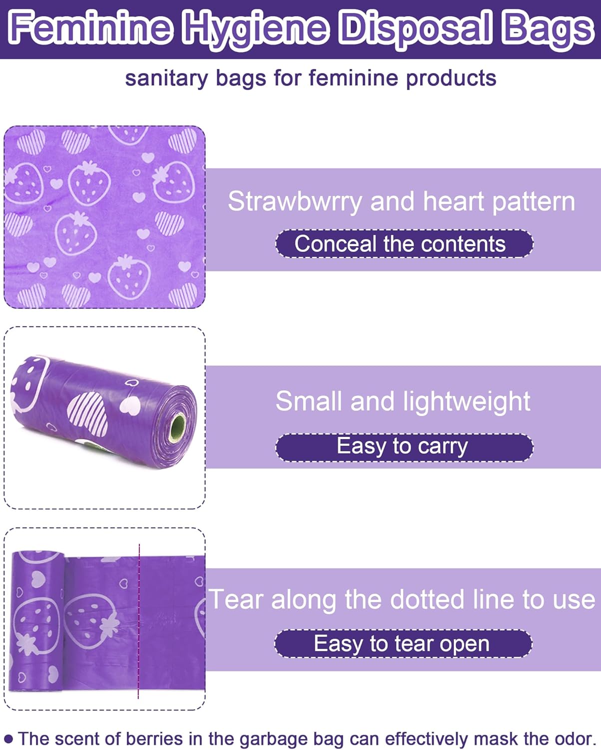 Beautiful & Hygienic — This feminine sanitary napkin disposal bag adopts strawberry print, with a sweet style, taking into account both privacy and beauty. The tampon disposal bag contains berry fragrance, which can well cover up the odor and maintain a clean and hygienic experience.