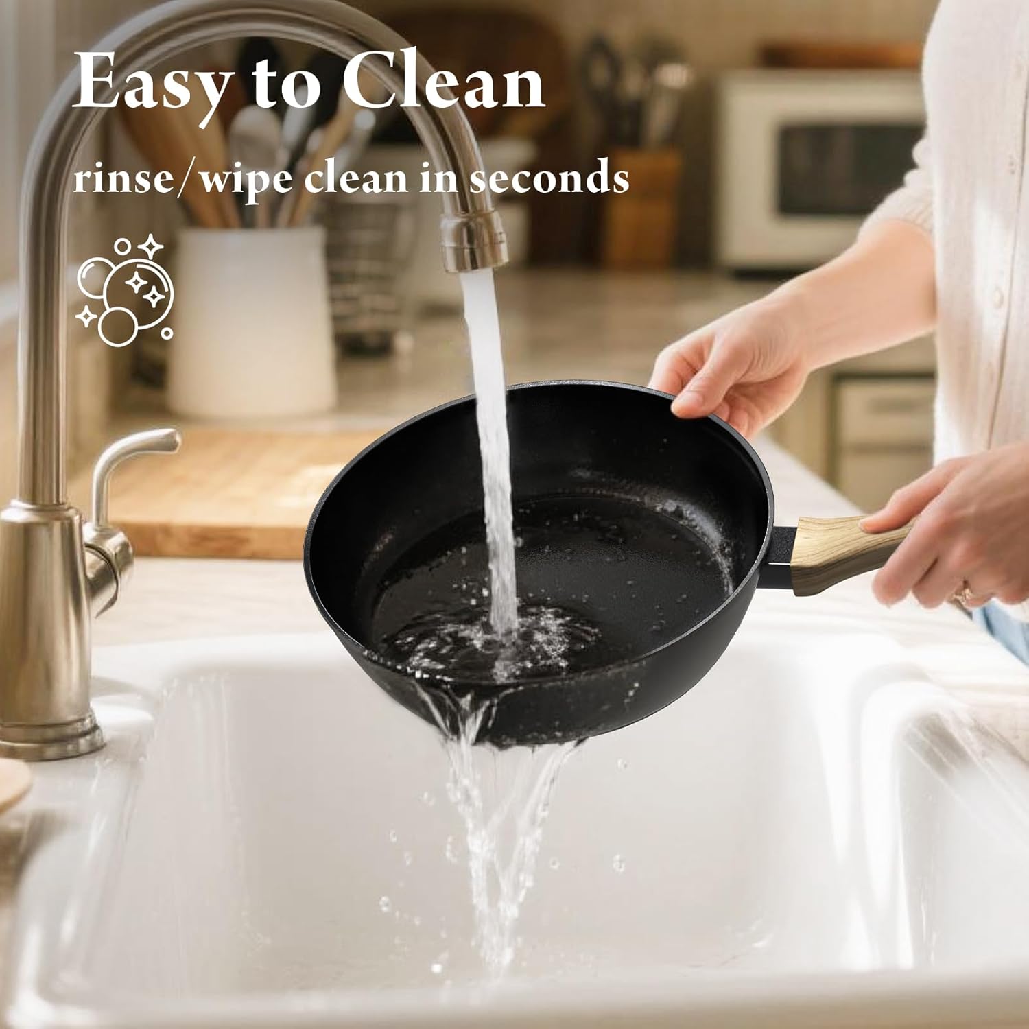 Safety First – Our cookware features natural ceramic nonstick,setting it apart from Teflon – free from harmful chemicals and heavy metals such as PFAS,PTFE,PFOA,lead, and cadmium.Prioritize your health with a toxic-free cooking experience.Built for Last – Stain & scratch-resistant,keeps great nonstick performance even after years of use. Smooth & Nonstick Surface with Low to Medium Heat Easy Cooking