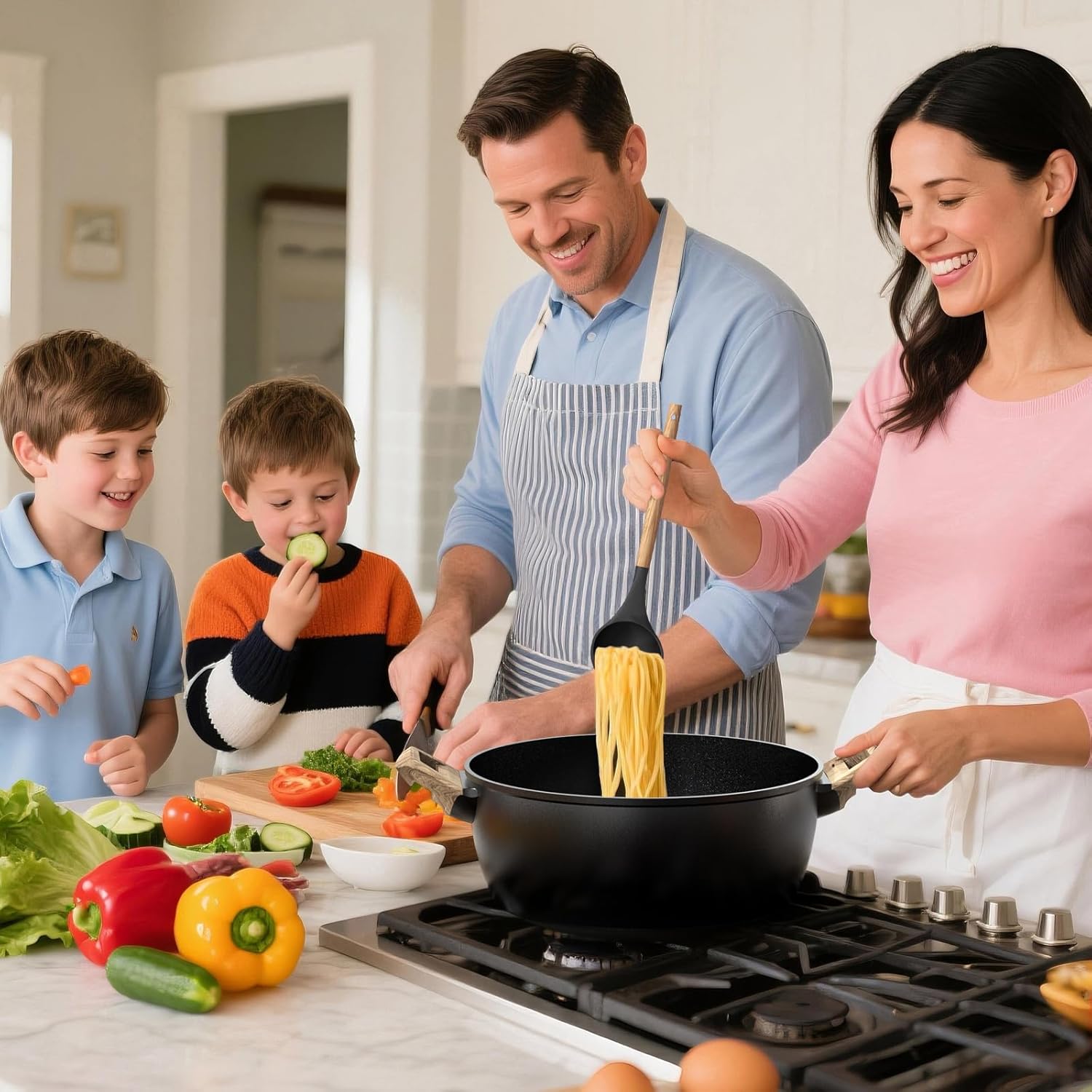 This comprehensive cookware set is thoughtfully designed to cater to the needs of large families, offering a variety of sizes and options to prepare meals for gatherings, special occasions, or everyday dining. You’ll have everything you need to cook delicious dishes that bring everyone together.