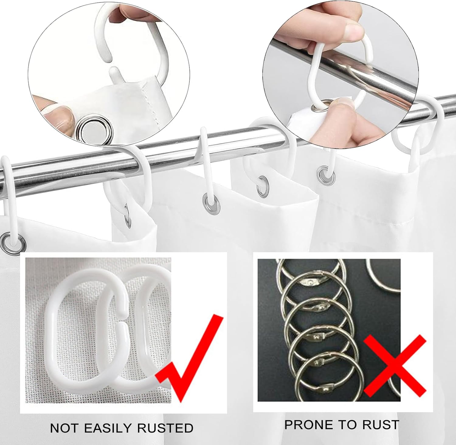 Secure Waterproof Design:12 rustproof plastic hooks grip tightly to shower rods up to 1.5cm thick. Weighted bottom hem prevents curtain billowing, while overlapping inner liner compatibility ensures complete water containment