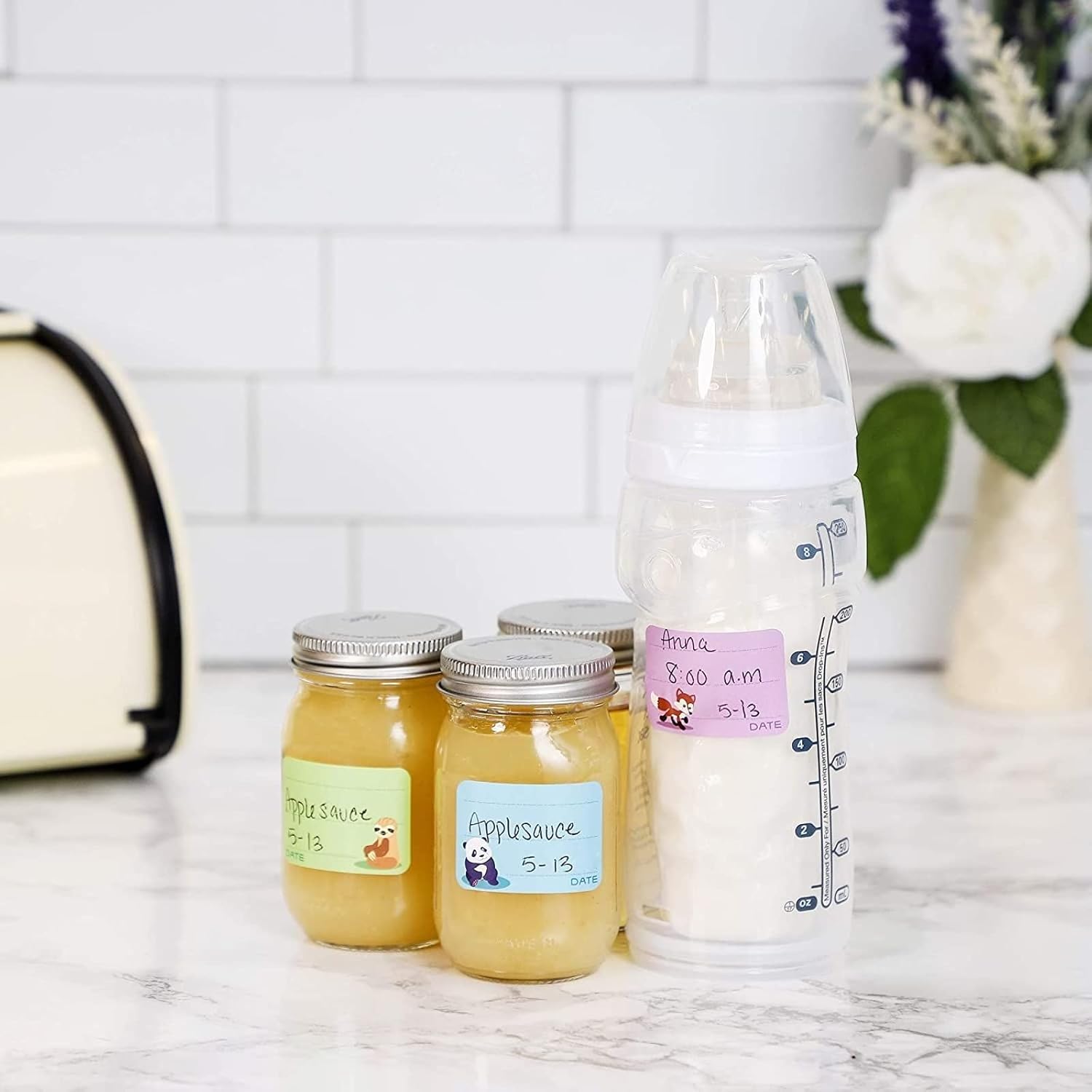 Each individual label measures 1.5 x 1 inches, just the right size for bottles and baby food jars.