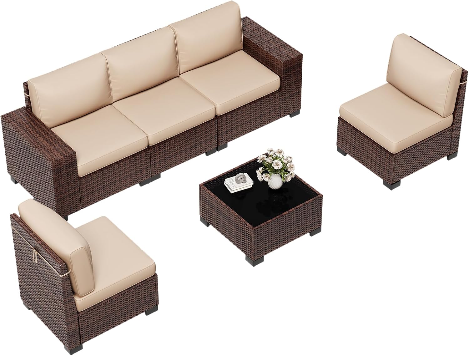 6 Pieces Outdoor Patio Furniture Set with Table Brown Rattan Sectional Sofa Conversation Sets for Balcony Lawn and Garden (Beige, 6 pcs w/Table)