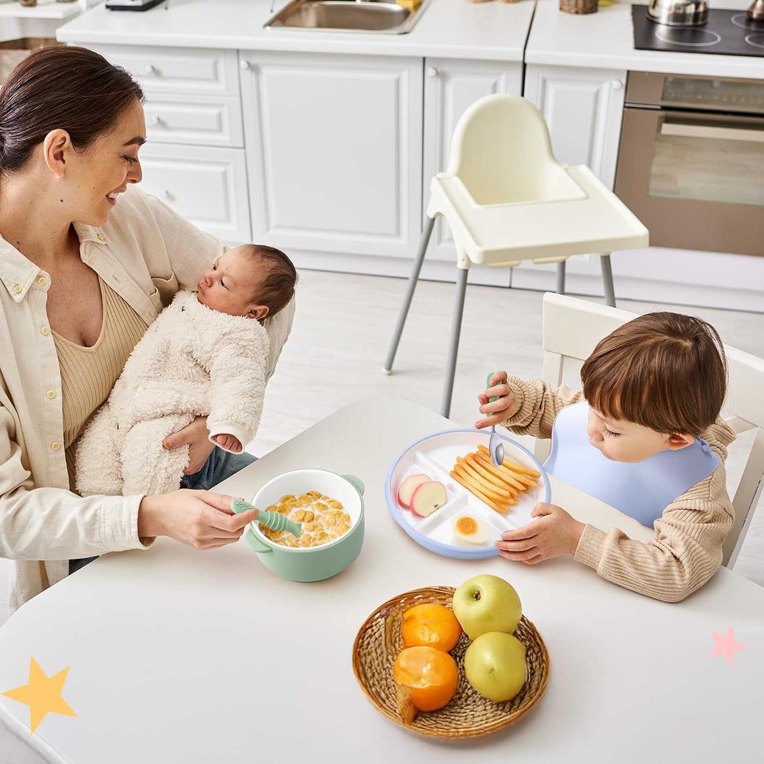 Complete Starter Kit: our baby feeding set includes everything you need to start feeding your little one! This silicone and porcelain tableware set includes 1 ceramic plate and silicone protective cover with suction cup, 1 ceramic soup bowl and silicone protective cover with suction cup; 2 silicone toddler spoons, 1 stainless steel fork, 1 stainless steel spoon, 2 baby bibs and 1 5.75 oz cup