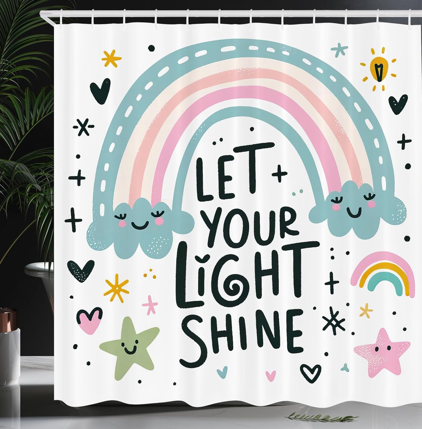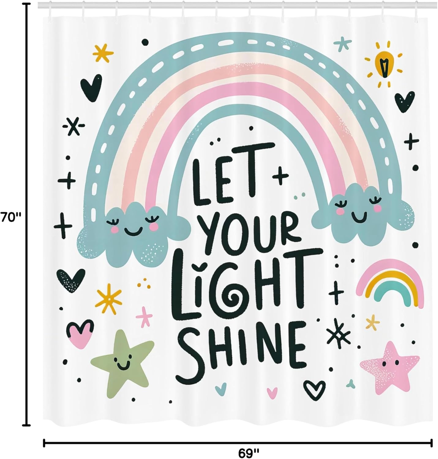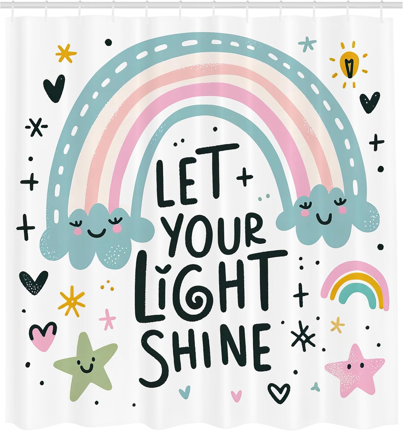 Ambesonne Cartoon Shower Curtain, Hand Drawn Look Rainbow Clouds and Stars with Happy Hopeful Phrase, Cloth Fabric Bathroom Decor Set with Hooks, 69″ W x 70″ L, Pale Teal Pink and Coral