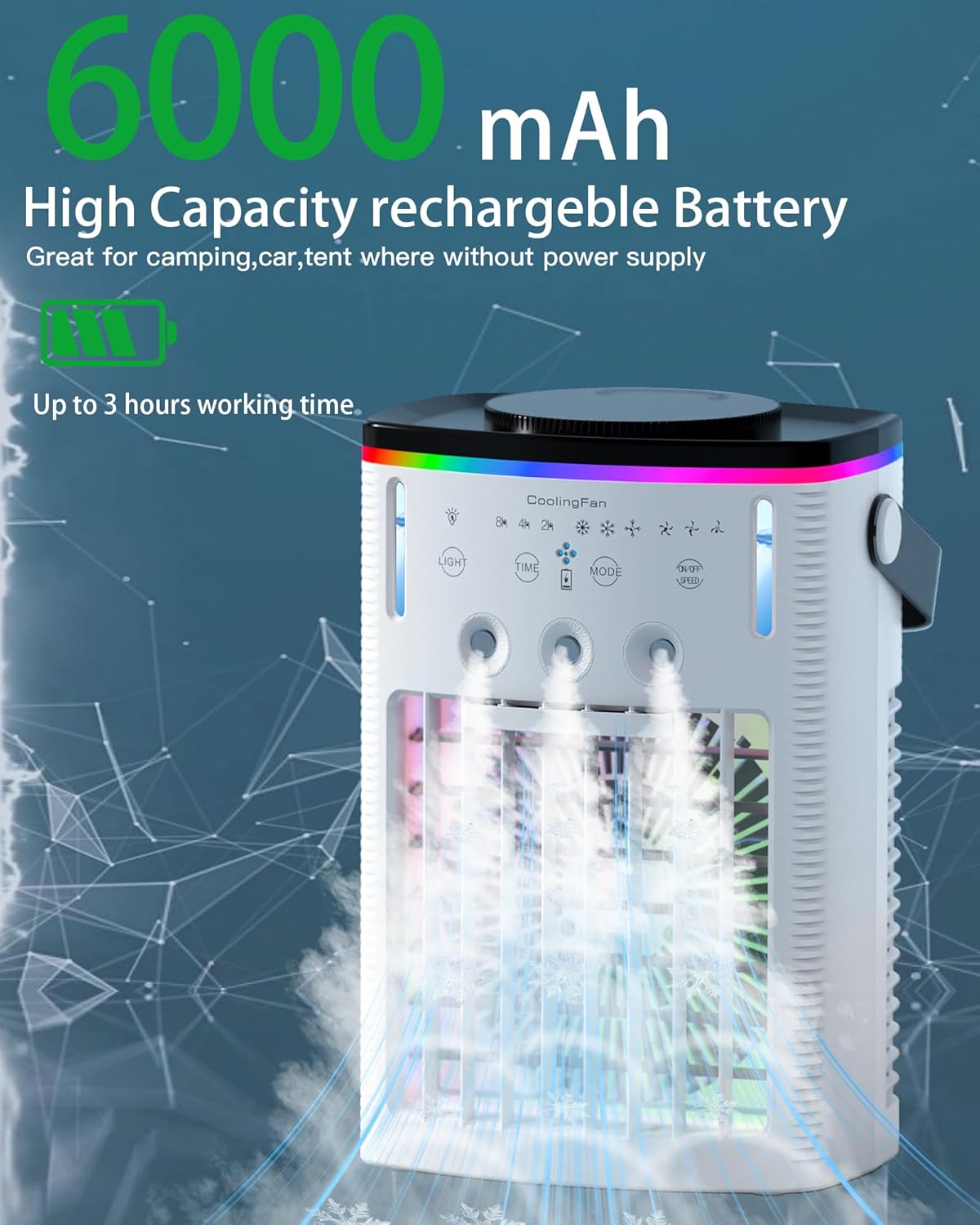 Versatile Rechargeable Air Conditioner for Tent, Car, and Bedroom: Stay comfortable in any environment with this rechargeable air conditioner. Whether you’re in your tent, car, or bedroom, it provides cool air and quiet operation for a restful experience.