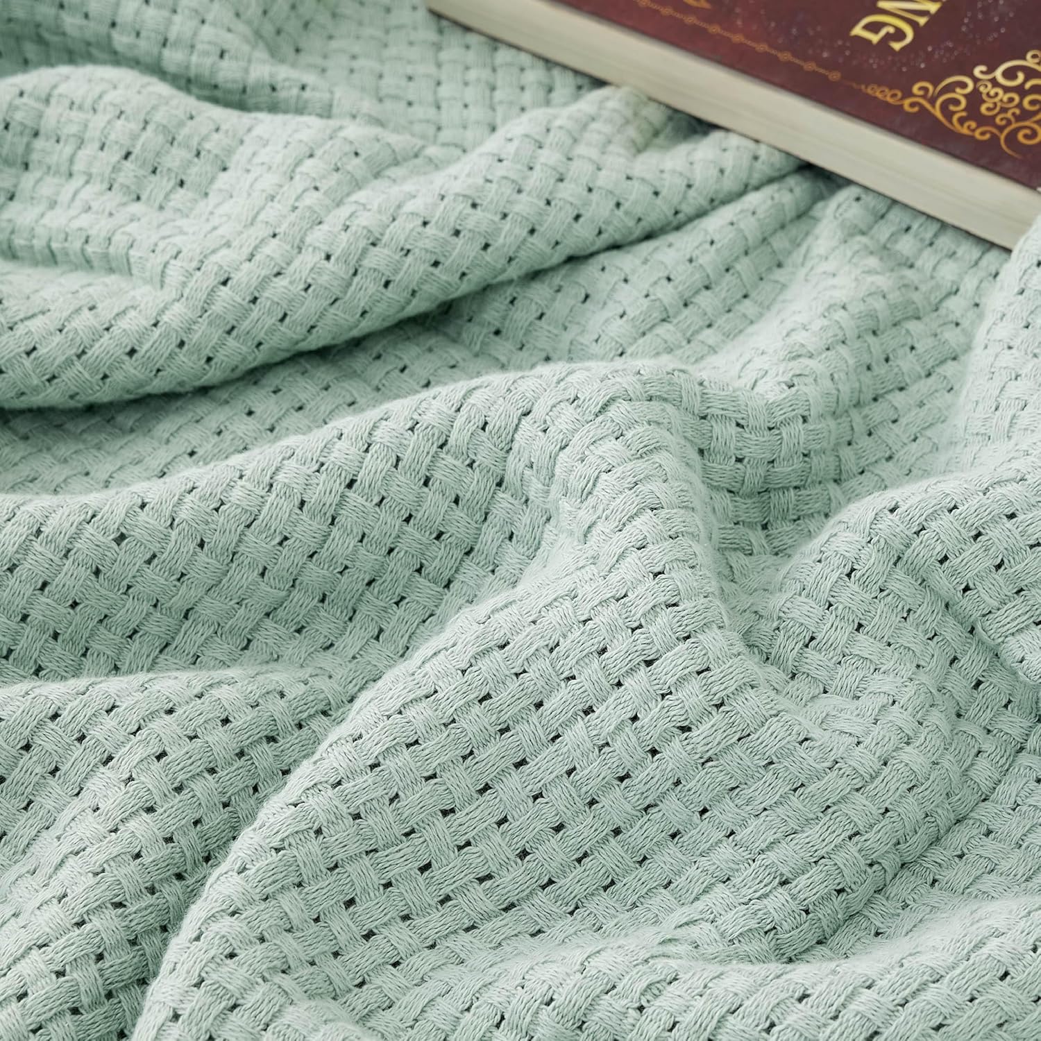 Bedsure 100% Cotton Blanket Queen Size for Bed – Breathable and Lightweight, Soft Cozy Basket Woven Blanket for Summer, Sage Green, 90×90 inches