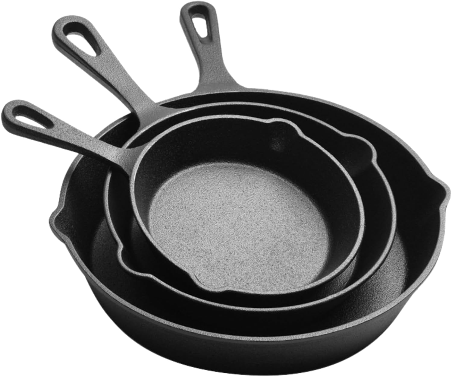 Material: This cast iron skillet set is made of durable cast iron; pre-seasoned for a natural non-stick surface and even heat distribution