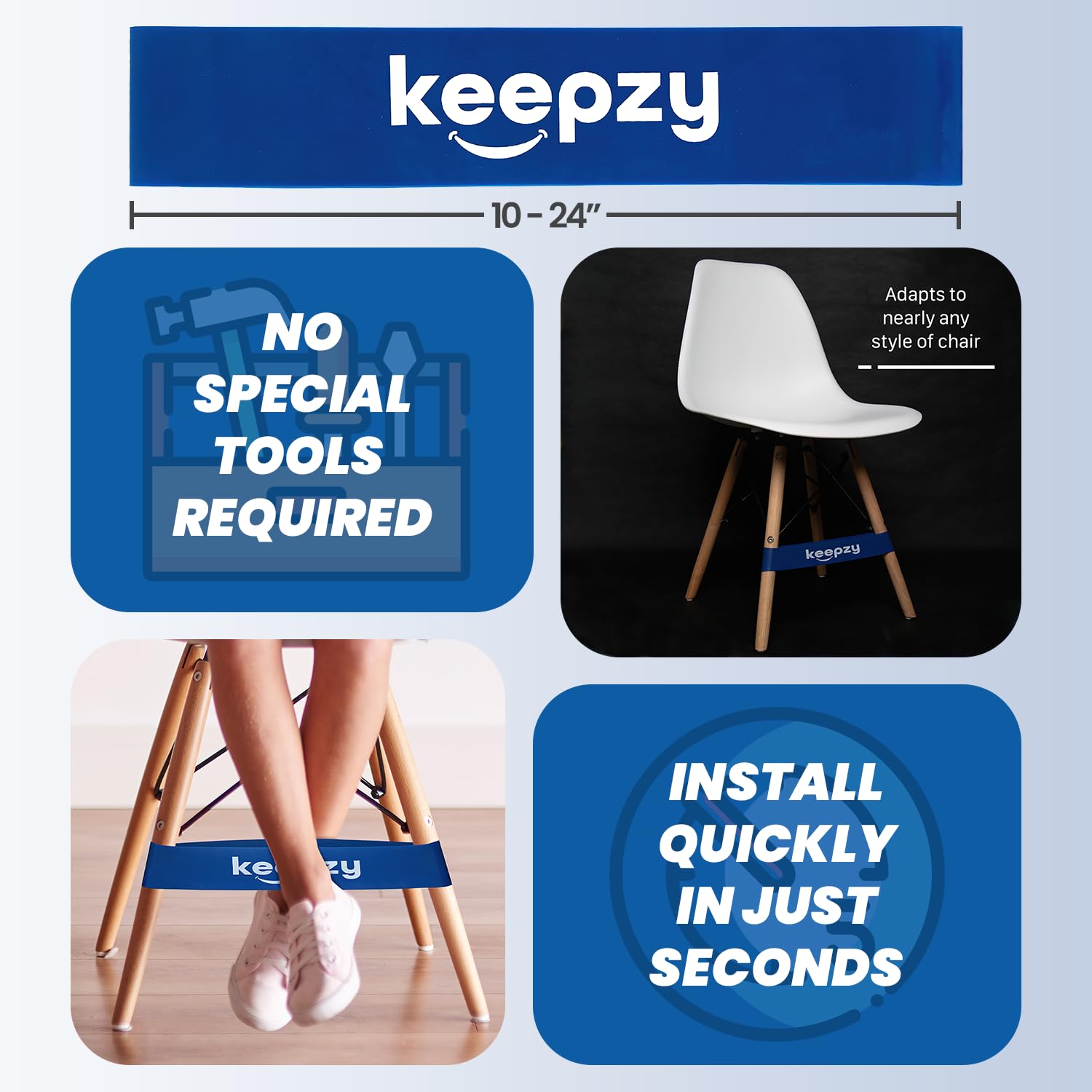 (Installs In Seconds & Satisfaction Guarantee) – Chair bands are simply installed by wrapping around the legs of a chair 10” to 24” wide. Easily adapts to nearly any style of chair or desk without requiring special tools or instructions. If you are not satisfied with our chair bands for any reason please contact us we provide 100% Money Back Satisfaction.