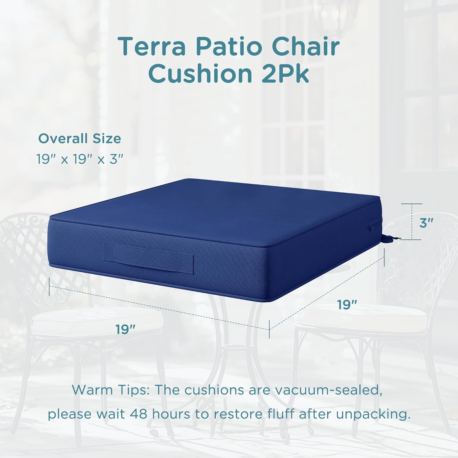Our 15x15x2.5 inch patio chair cushions are tailored for bistro chairs, bar stools, or garden accent seating. Durable design withstands sun, rain, and wind, ensuring comfort in any outdoor environment.