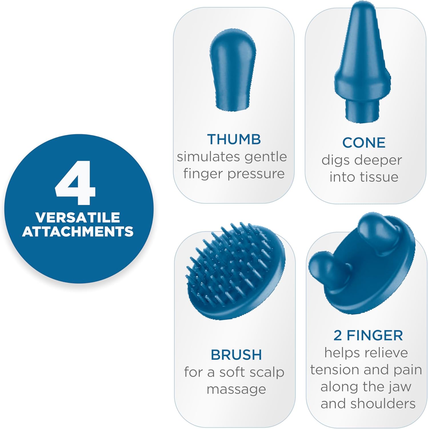 4 Versatile Attachments: Thumb attachment simulates gentle finger pressure; Cone attachment digs deeper into tissue; 2-Finger attachment helps relieve tension and pain along the jaw and shoulders; Brush attachment gives a soft scalp massage. Attachments detach for easy cleaning and have a silky-soft rubber paint finish.