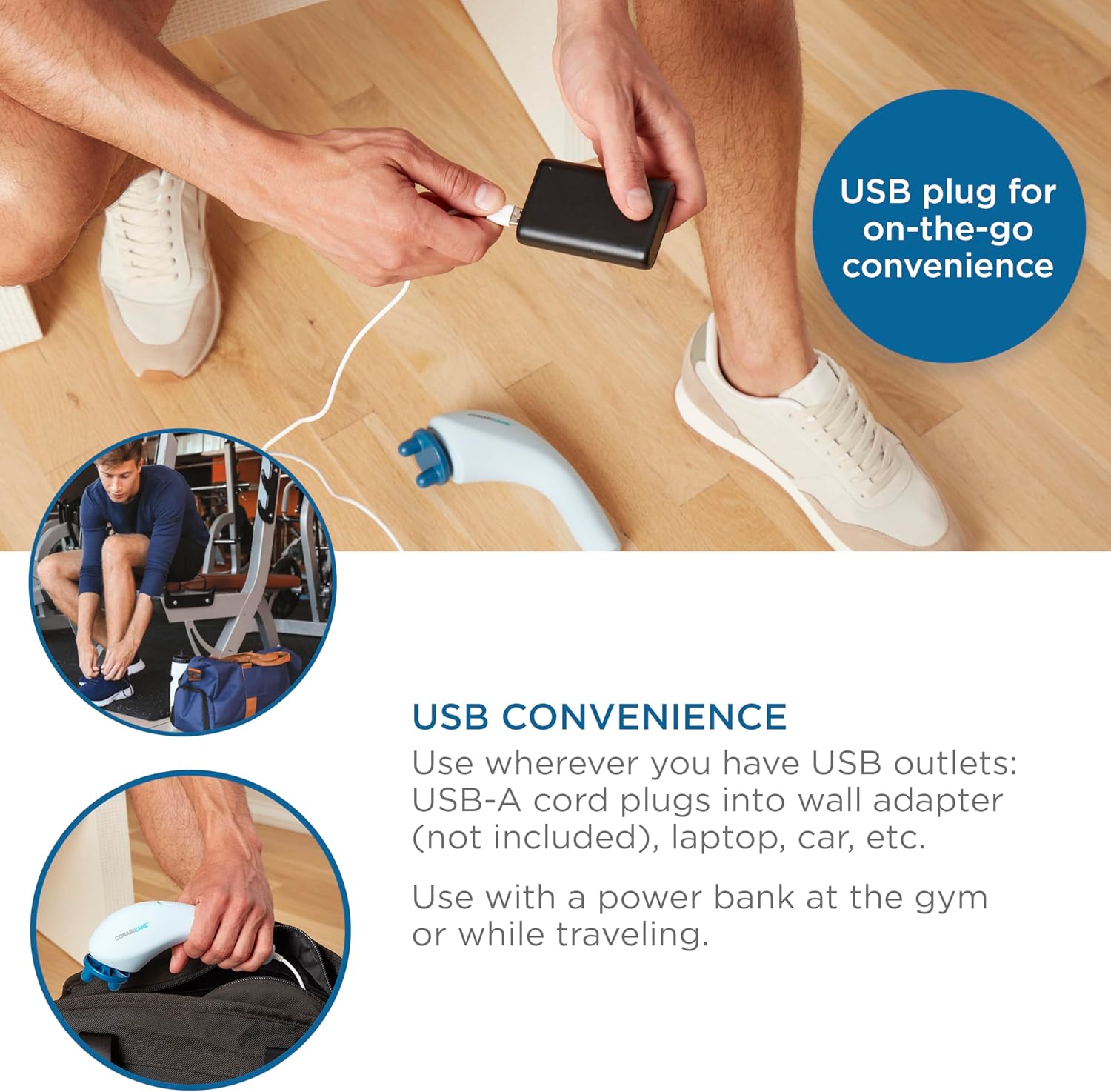 USB Plug for On-the-Go Convenience: USB-A cord plugs into wall adapter (not included), laptop, car, etc. Use with a powerbank at the gym or while traveling.