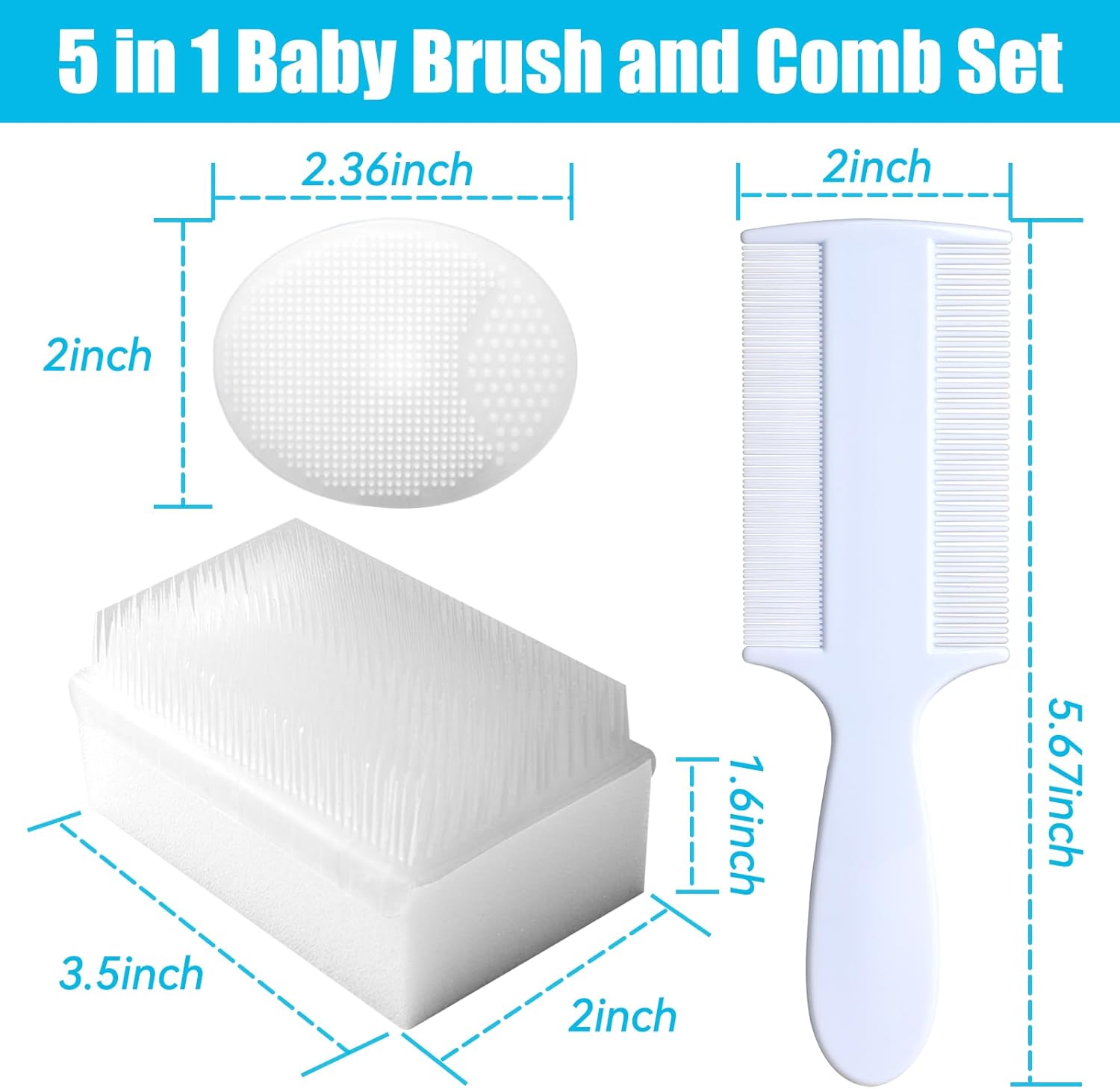 5-in-1 Baby Brush and Comb Set: This set includes 2 x soft bristle and sponge brushes, a dual-sided comb, and 2 x silicone cradle cap brushes, which can keep your newborns and toddlers in well groomed while ensuring comfort