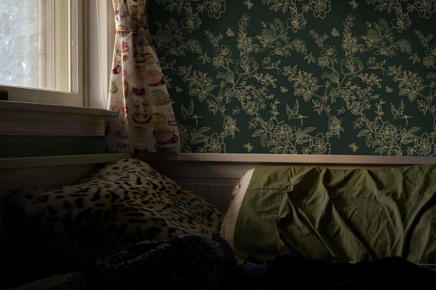 Floral Gold and Dark Green–【UNIQUE DESIGN】Elegant gold and dark green floral wallpaper. With a dark green background, it is decorated with flowers, birds, butterflies and leaves. Exquisite retro flower and bird patterns, full of vitality and hope, for your home decoration to create a warm and comfortable atmosphere.