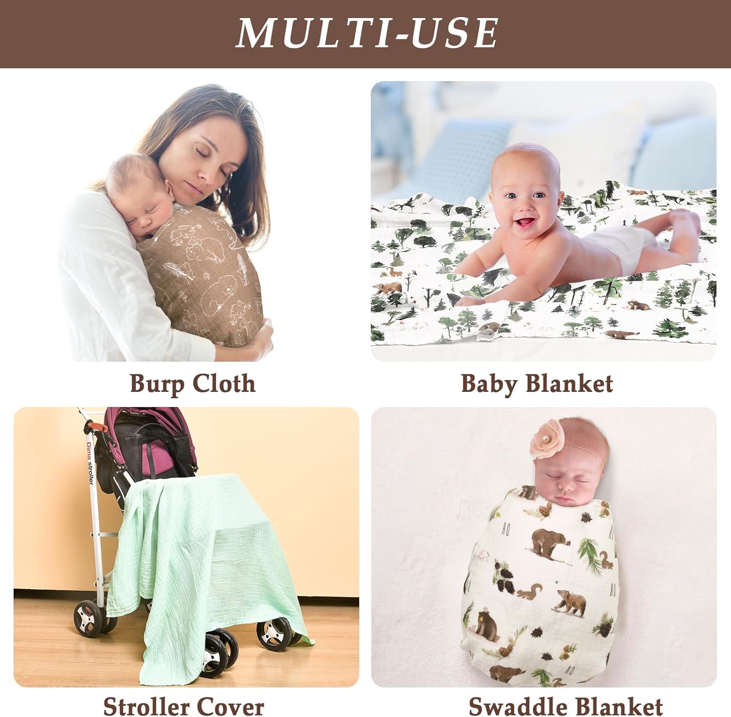 Most Useful Baby Product: Our 4-packed muslin swaddle blankets, perfect for easy changing and washing, feature a large size of 47×47 inches. Larger size design removes parents’ worry of babies outgrowing the blankets soon as they transition into their toddler years. Our muslin blankets are multifunctional for year-round use. Their usage varies from swaddling blankets to nursing covers, burp cloth, pram covers, bath towels, baby stroller, picnic or tummy time blanket, diaper changing mat and play mats.