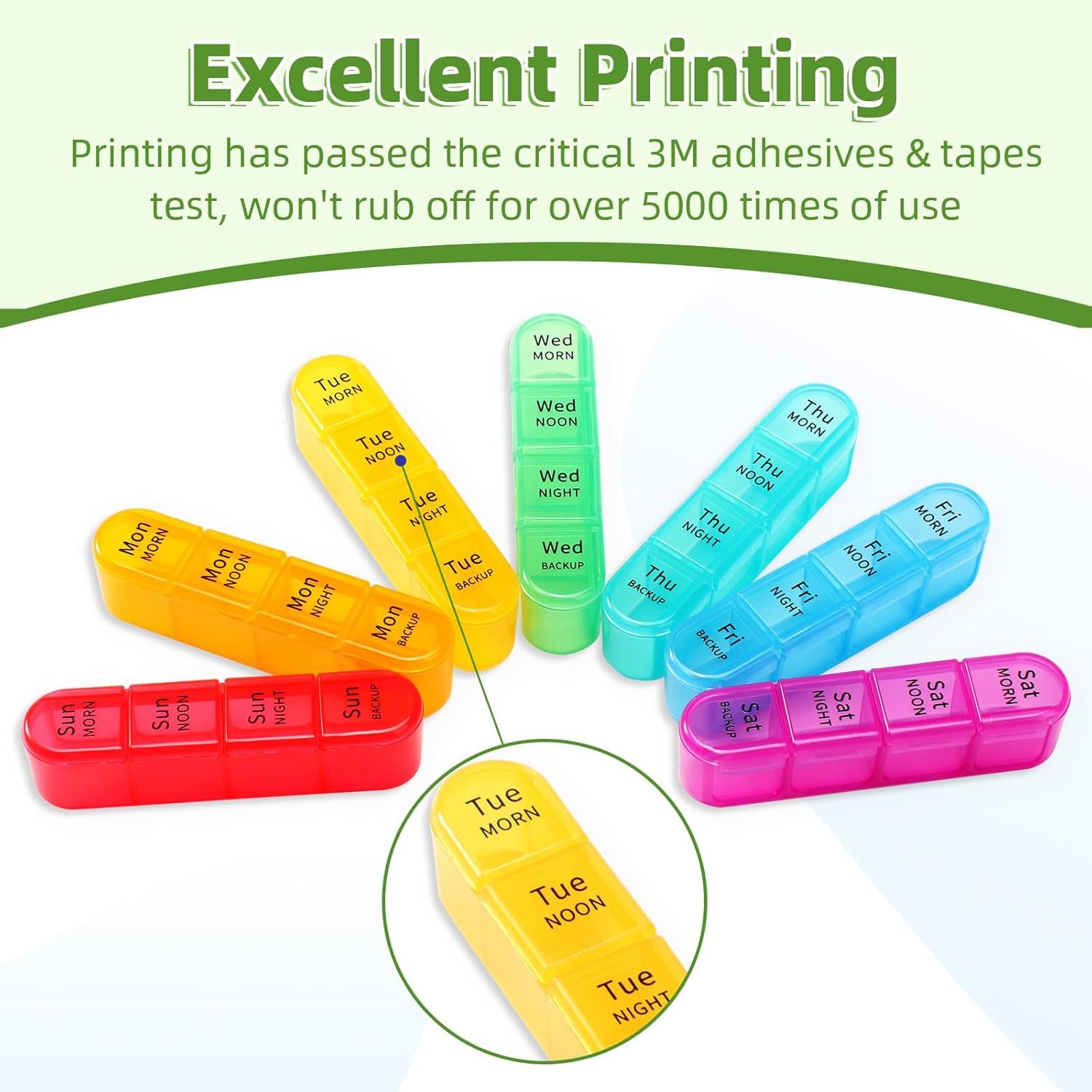 Excellent Printing – Bold letter marks on the daily pill box organizer will remind you what to take by the day. The printing of the medicine box have passed the critical 3M adhesives & tapes test, won’t rub off for over 5000 times of use