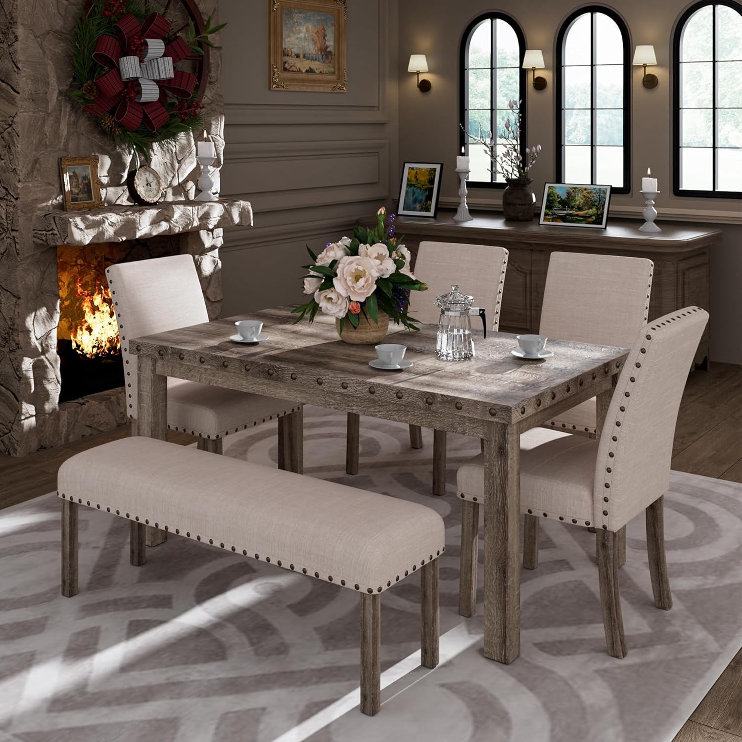 Be the first to review “Dining Table Set for 6, 6 Piece Farmhouse Dining Set, Country Style Kitchen Table, 4 Upholstered Chairs & Bench”