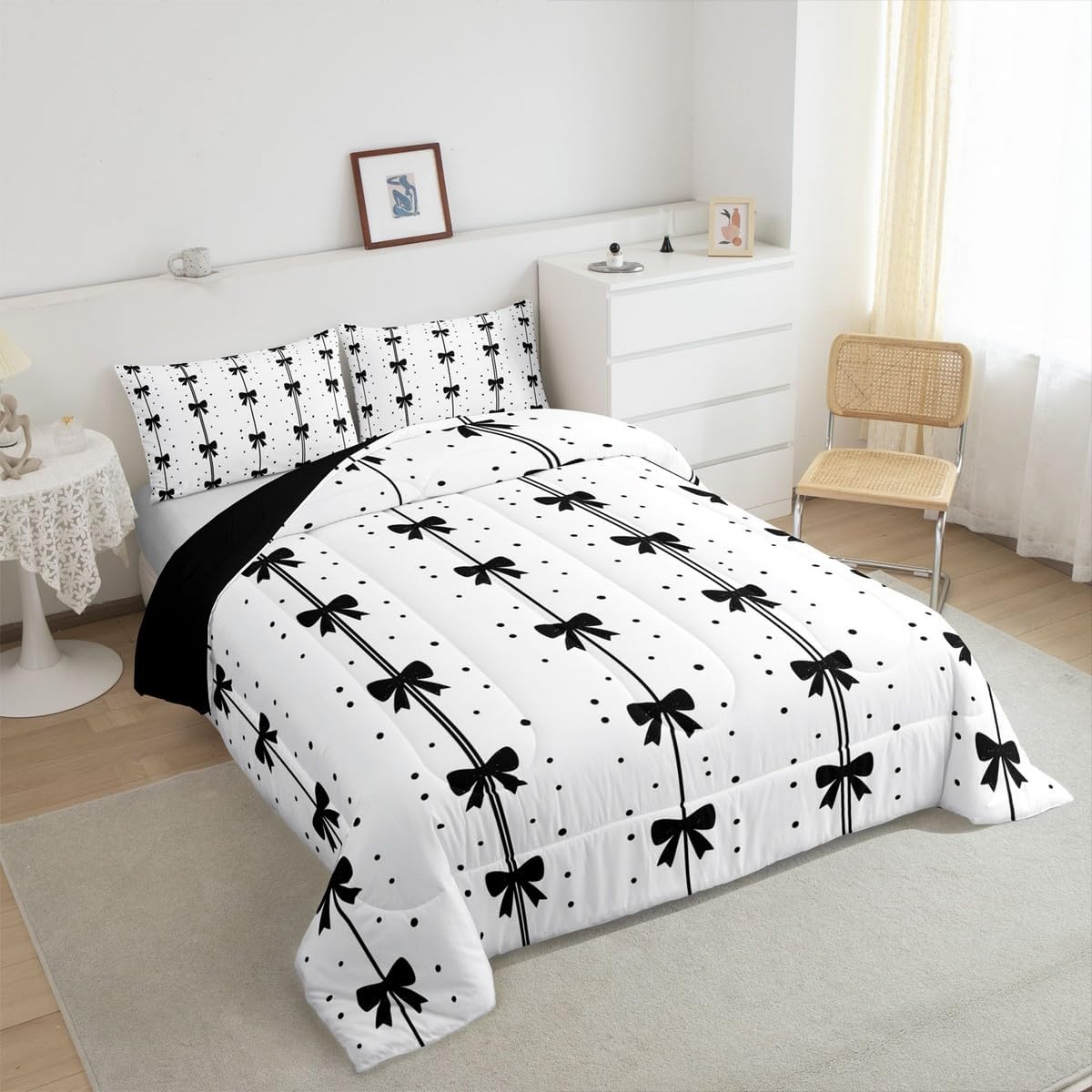 Erosebridal 2 Piece Bowknot Bedding Set Twin Size, Black Bow Knot Comforter Set Butterfly Knot Princes Bedding Comforter Sets Girly Bow Cartoon Style Duvet Insert Geometry Dots Bowknot Decor