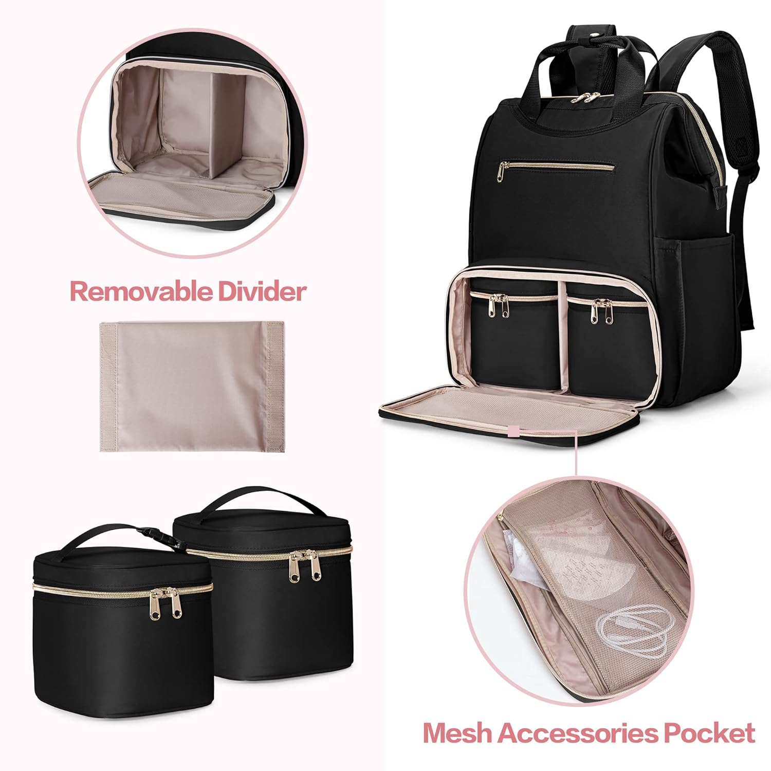2 INDIVIDUAL BAGS – The bottom section equipped with a small cooler bag for 4-5 oz. baby bottles and a padded tote bag for breast pumps. A removable dividers inside to fix 2 bags in place and ensure the stability of structure. (Small bags measure 6.3×6.3×6.2inches. )