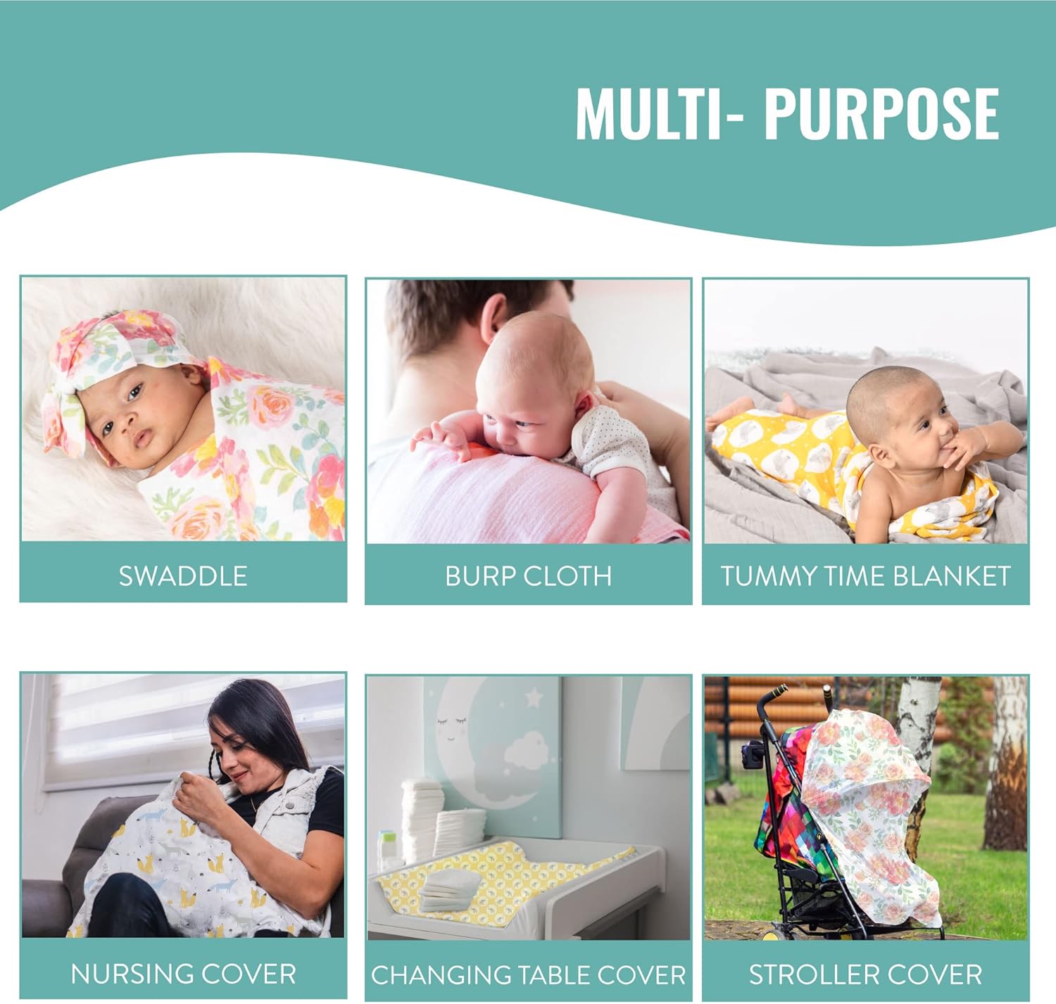 Multipurpose Blankets: Beyond swaddling, these blankets serve as receiving blankets, nursing covers, stroller covers, burp cloths, car seat covers, play mats, changing pads, mini crib sheets, and more.