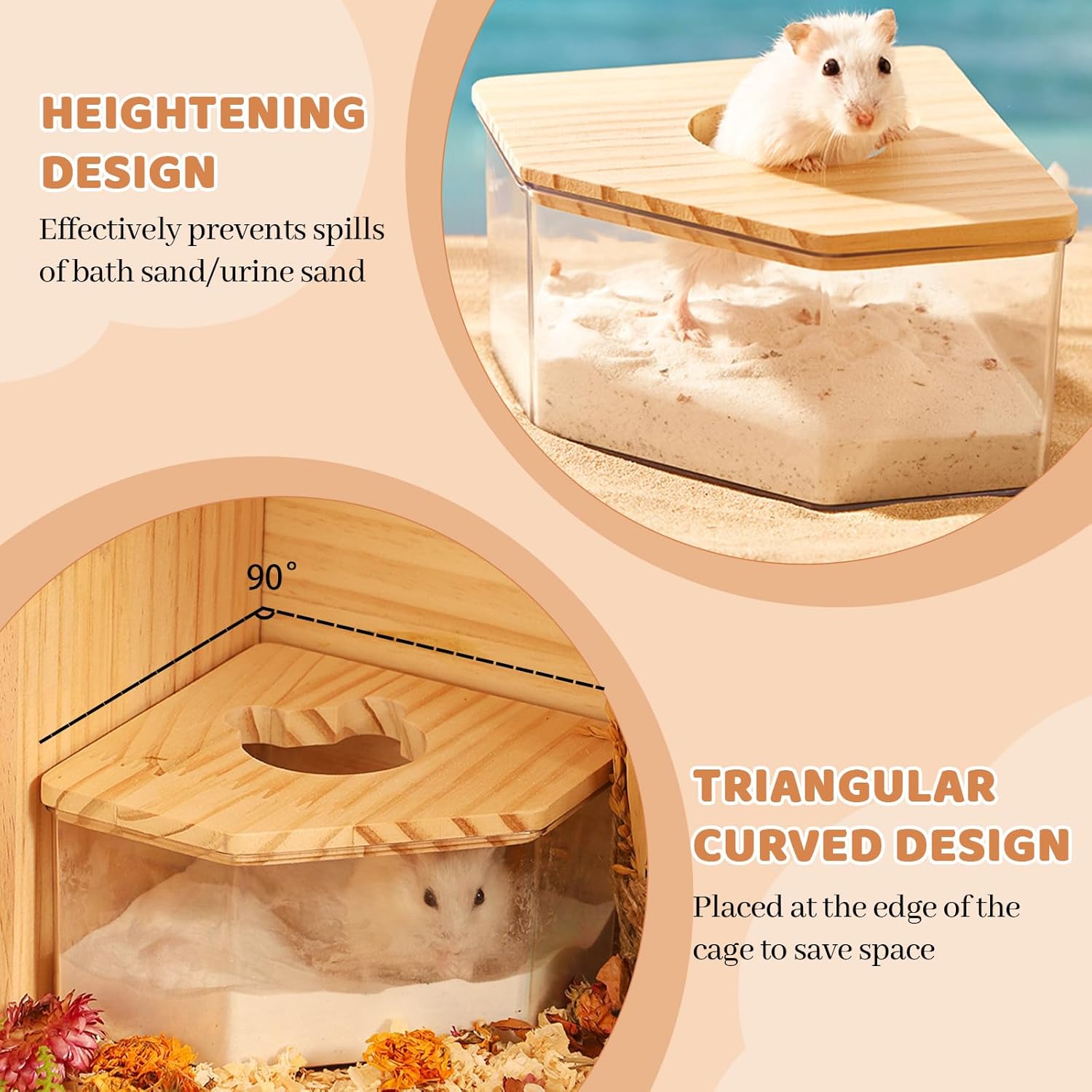 【Comfortable and Safe】Not only is this hamster sand bath kit comfortable and safe, its advanced design also has the well-being of pets in mind. All the components of the bathroom are tightly fastened together, and the natural solid wood baffle at the top enhances the stability of the structure, making it impossible for hamster to easily tip it over, increasing its safety.