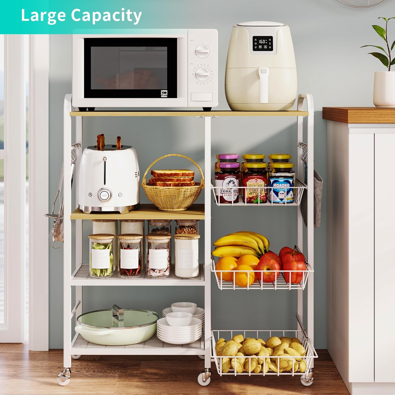 [Large Capacity Multi-Tier Storage]: This kitchen storage cart offers multiple tiers of storage, including 4 open shelves and a spacious tabletop, perfect for organizing a microwave, toaster, fruits, spices, and other kitchen essentials. This kitchen cart can help you easily organize your kitchen, maximizing space and providing quick access to your items