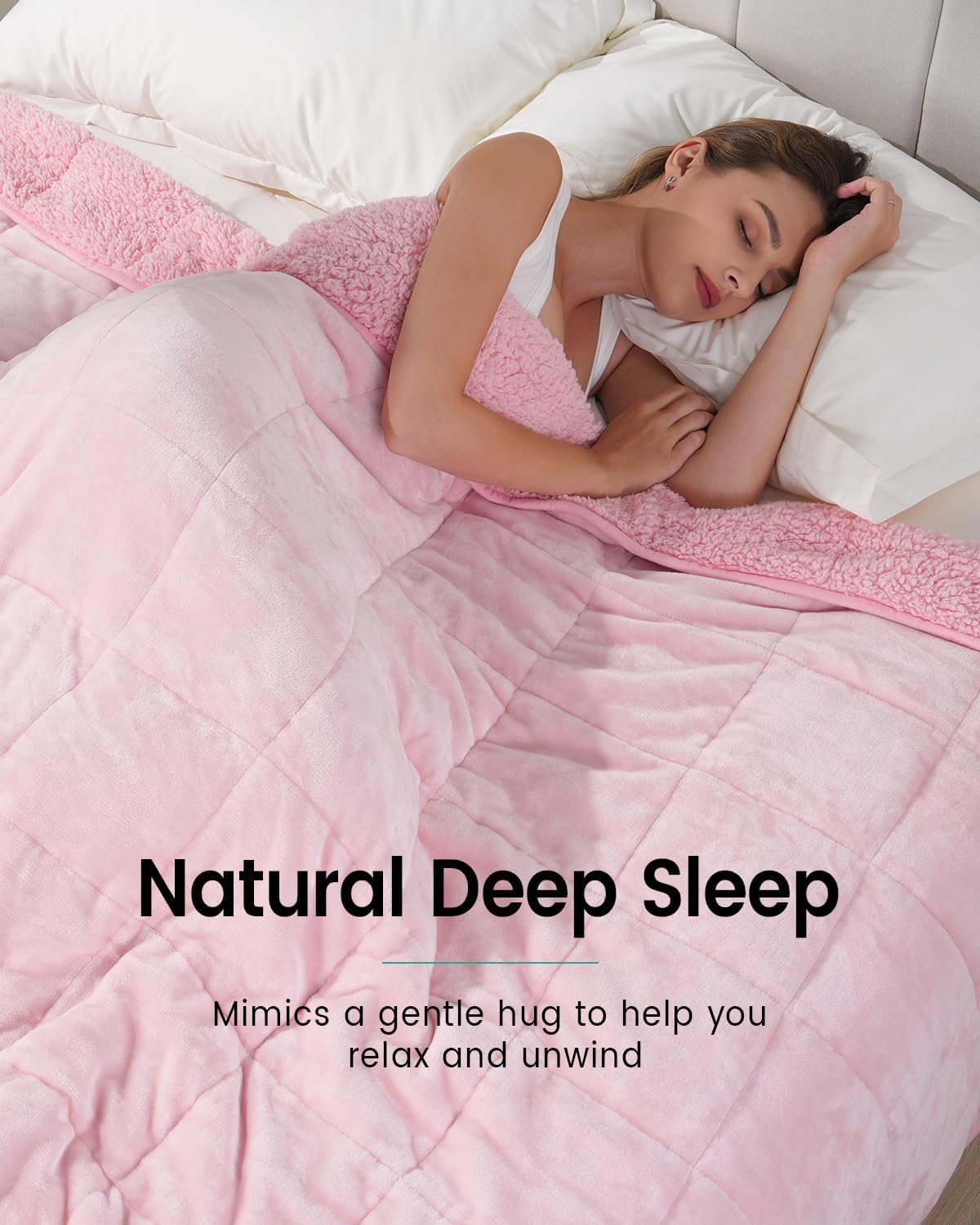 Ideal Double Side: The Sherpa fleece weighted blanket features 220 GSM ultra-soft fleece top and 220 GSM fuzzy Sherpa reverse that are pink both ways. The uniformed color offers a fresh sensation of peace and gets tranquil and profound sleep.