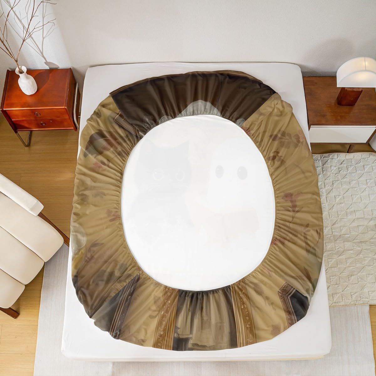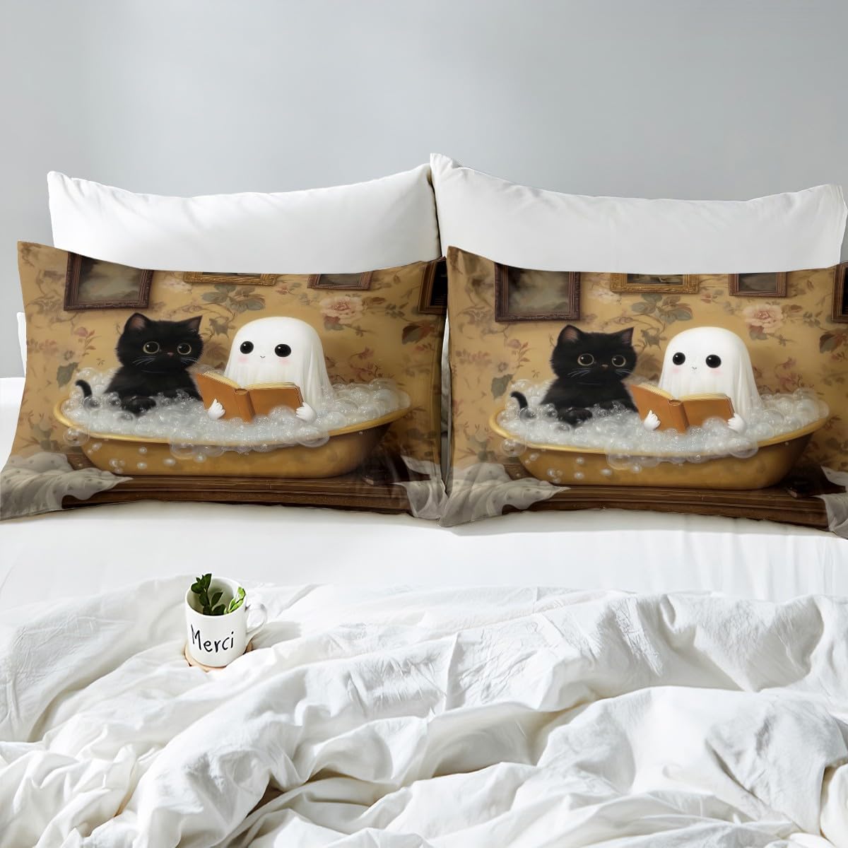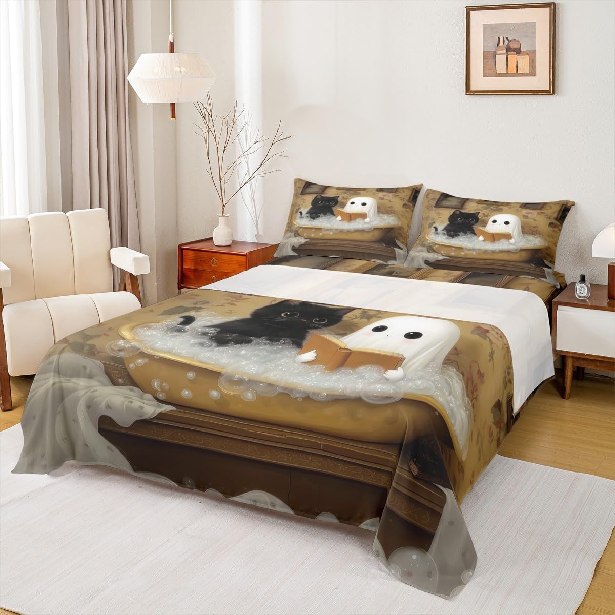 jejeloiu Cute Ghost Bed Sheets Set Full Size Kids Black Cat Halloween Fitted Sheet for Boys Girls Have a Bath Bedding Set Soft Microfiber Room Decor(with 2 Pillow Cases)