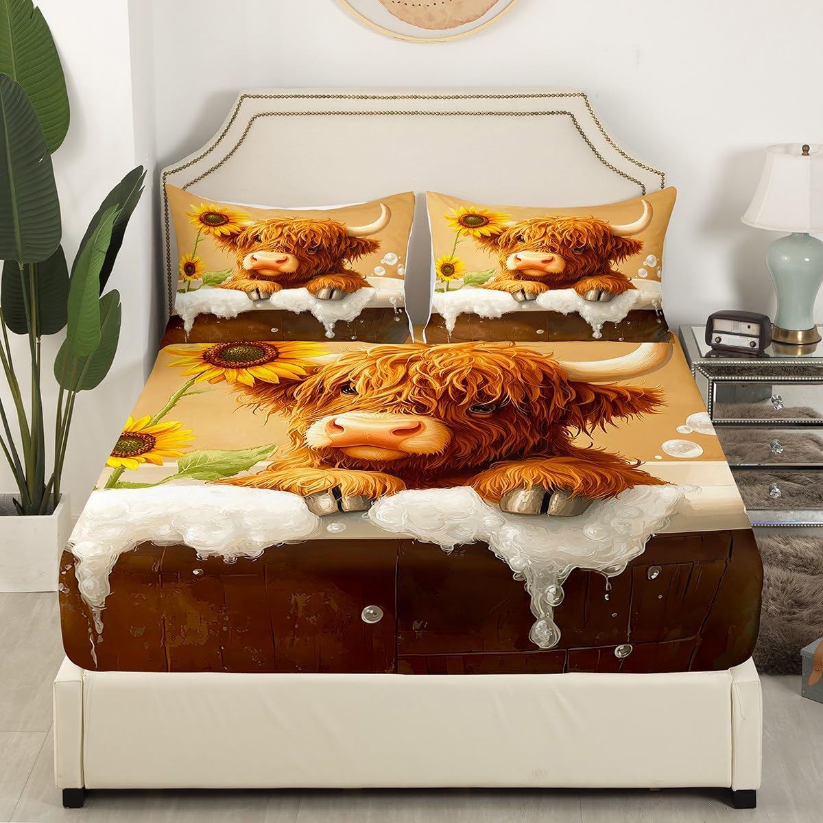 jejeloiu Kawaii Highland Cow Bed Sheets Set for Kids Boys Girls Twin Size Cartoon Animal Fitted Sheet Highland Cattle Bath Bedding Set Sunflower Bed Cover Room Decor Farmhouse