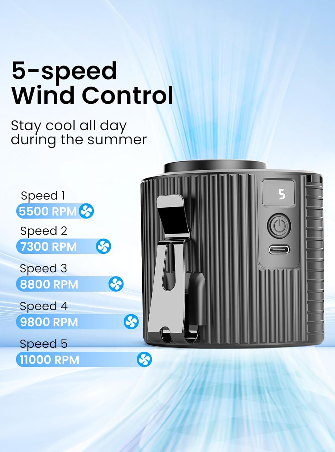 【Adjustable 5 Speeds】Our cool clip fan under shirt fan has four different wind speeds, from Speed 1 to Speed 5, and the motor speed is 5,500rpm to 1,1000rpm. Suitable for your different needs, you can enjoy the low-noise and gentle wind of speed 1, or feel a strong cool breeze of speed 5.