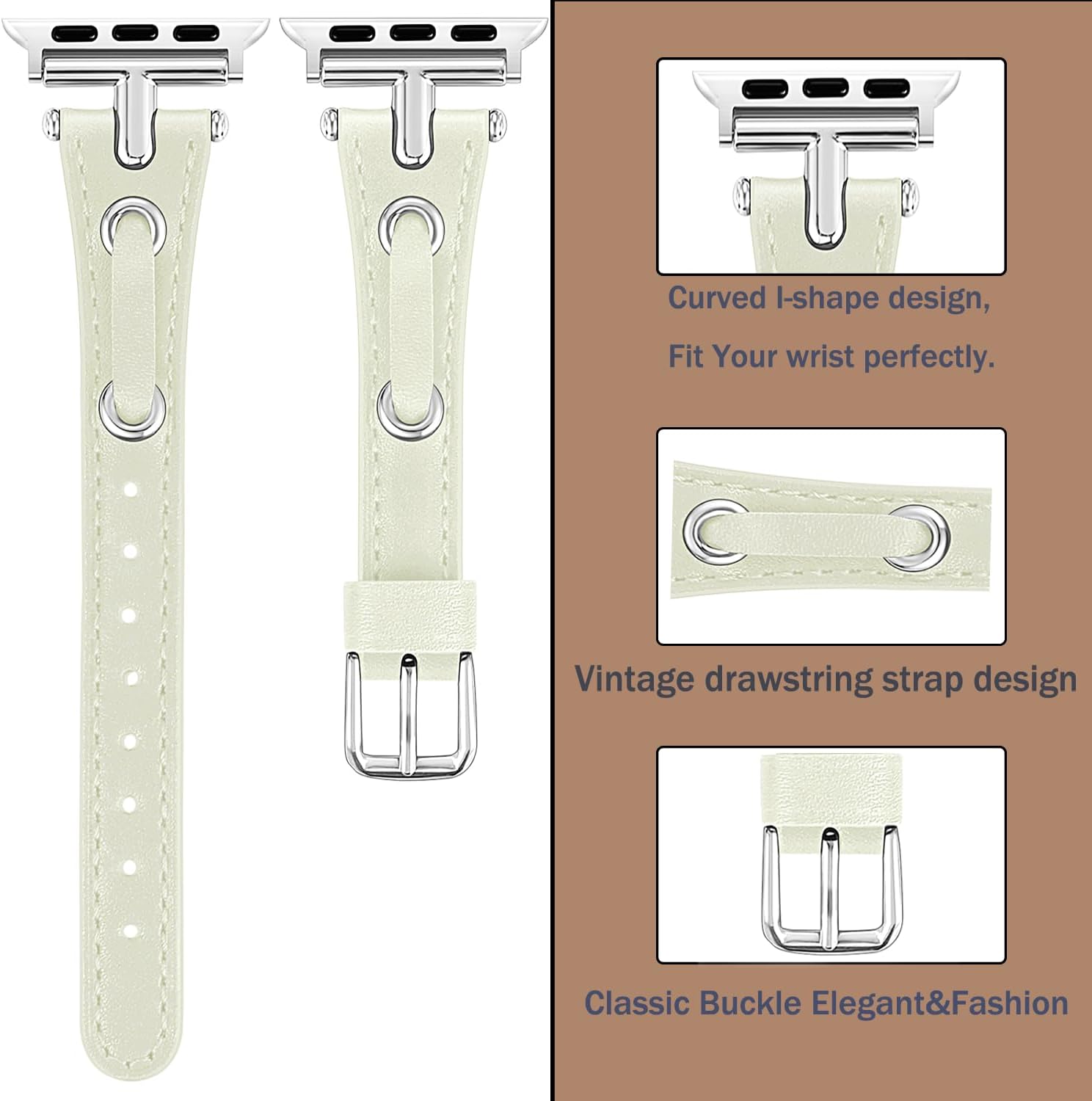Leather Slim Band Compatible Apple Watch Christmas with Charms Strap Women 38mm 40mm 41mm 42mm 44mm 45mm 46mm 49mm, Dressy Fancy Silver Brown White Gold Leather Thin Wristband with T-Shape Metal Buckle for iPhone Watch Band Series 10 9 8 7 6 5 4 3 2 1 SE (Ultra 1 2)