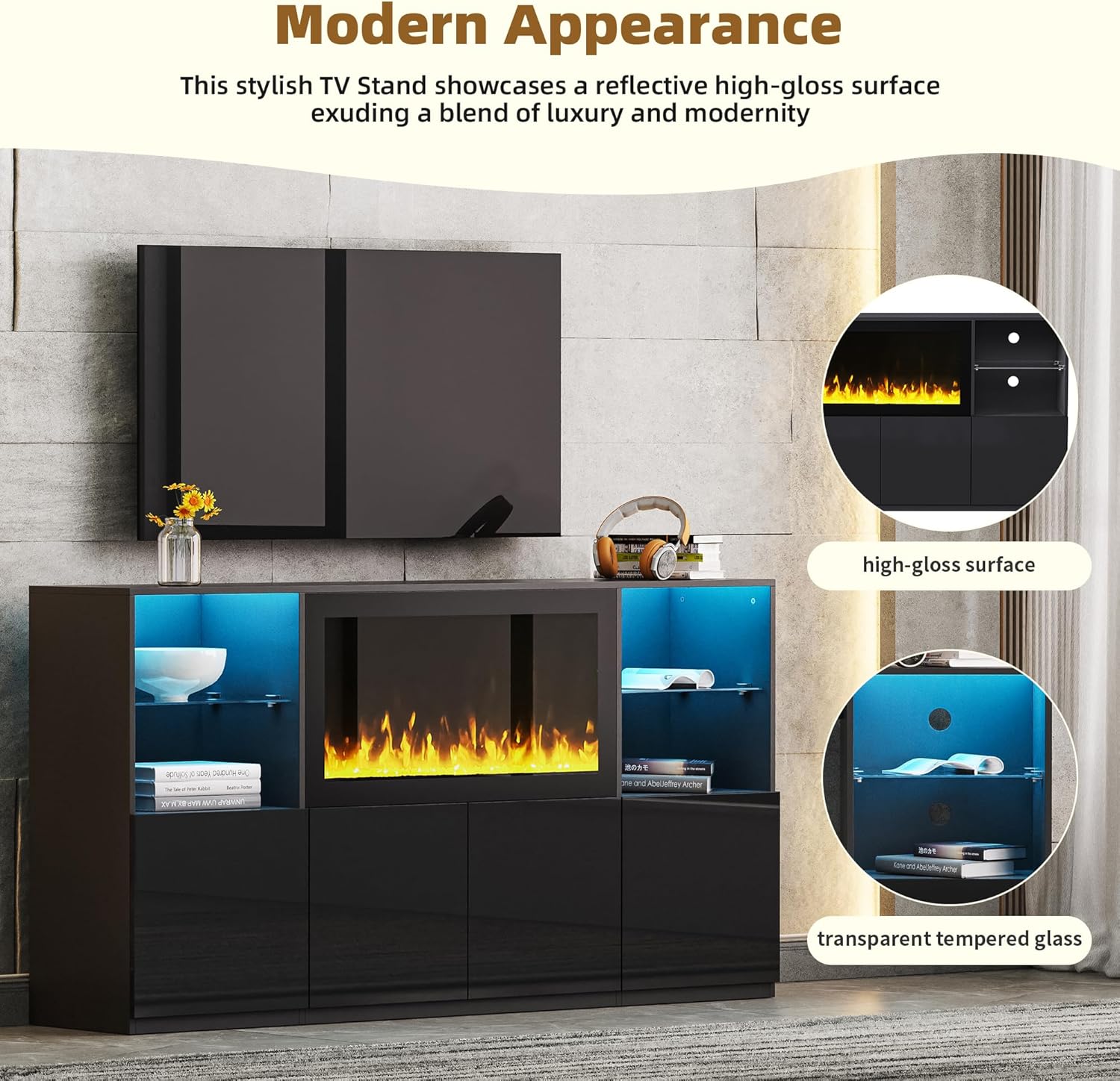 Merax High Gloss TV Stand with 34.2″ Non-Heating Electric Fireplace, Modern LED Entertainment Center & Two Tall Pantry Cabinets and Tempered Glass Shelves, Media Console Set for TVs up to 75″, Black