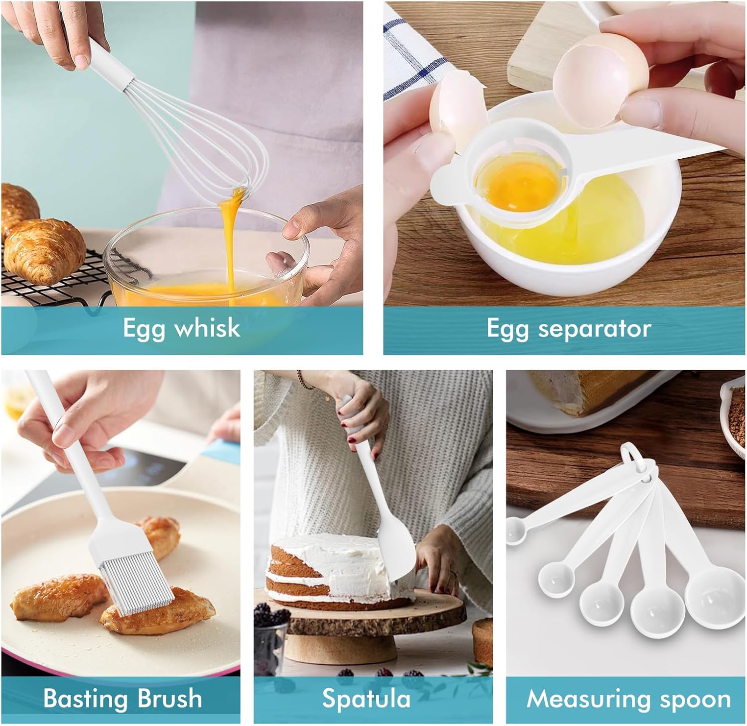 Nesting Design: Included of 4 different size mixing bowls and 4 matching lids, which particularly beneficial for kitchens with limited storage space. Offer a complete set of baking utensils (9 psc)without taking up excessive room as well.
