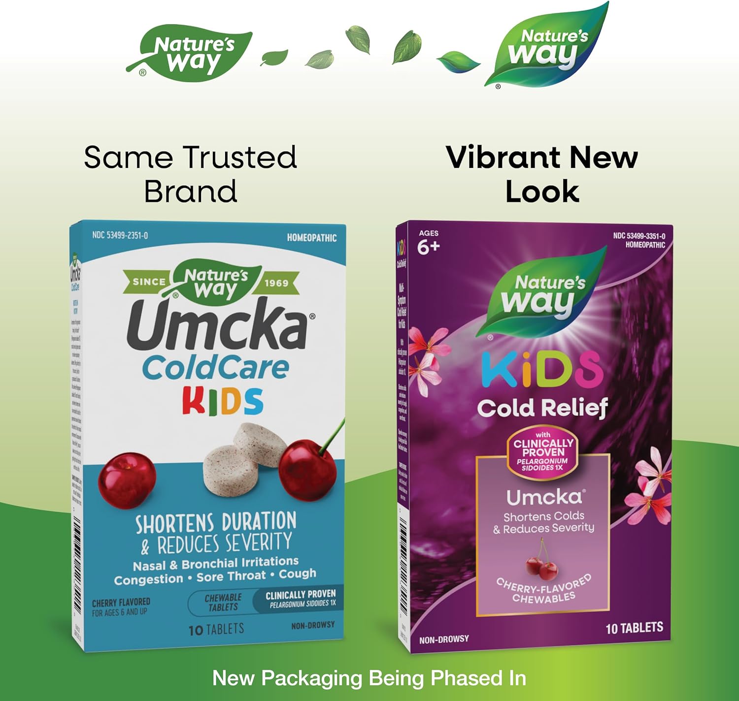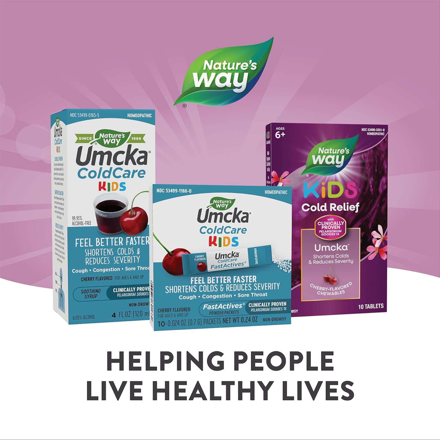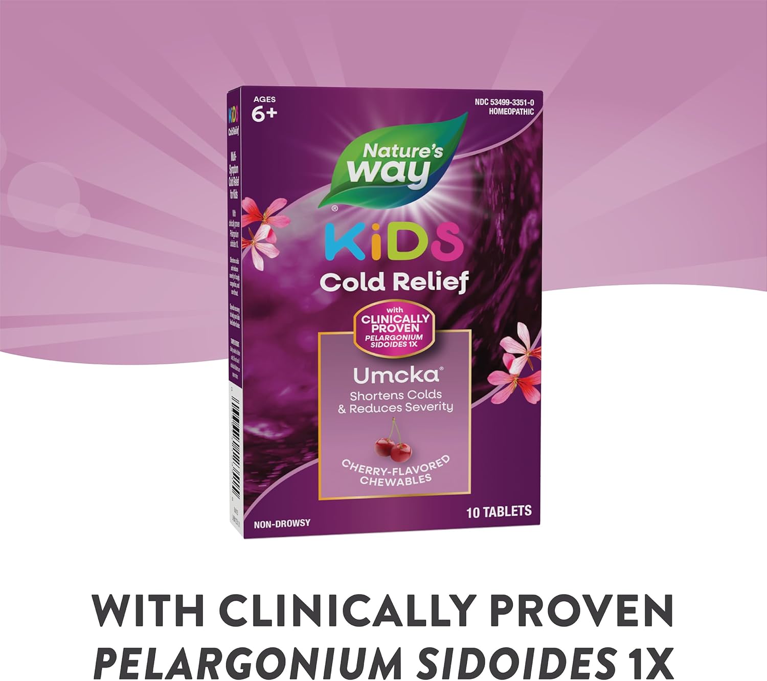 Nature’s Way Cold Relief for Kids 6+, Umcka, Shortens Duration & Reduces Severity, Multi-Symptom Cold Relief, Homeopathic, Phenylephrine Free, Cherry Flavored, 10 Chewable Tablets