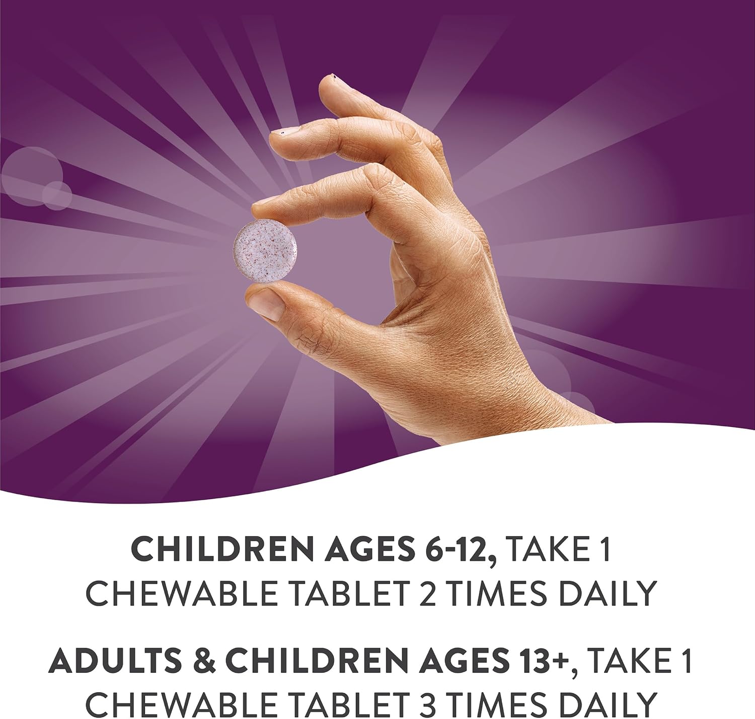 Children ages 6-12, chew one tablet twice daily. Adults and children 13 years of age and older, chew one tablet three times daily.