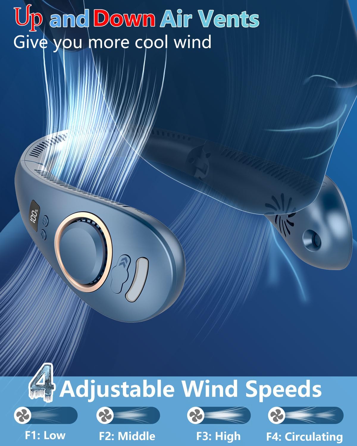 ❄️【Up and Down Double Air Vents】AJGJF portable neck fan is designed with dual upper and lower air vents, increasing the airflow speed to quickly dispel hot air and provide you with a faster cooling experience. 4 gear adjustable wind speed,you can adjust the airflow according to your preference. Whether you need a gentle breeze or a strong wind, you can easily control the wind speed.(Note: Please wear it correctly according to the left and right markings on the misting fan)