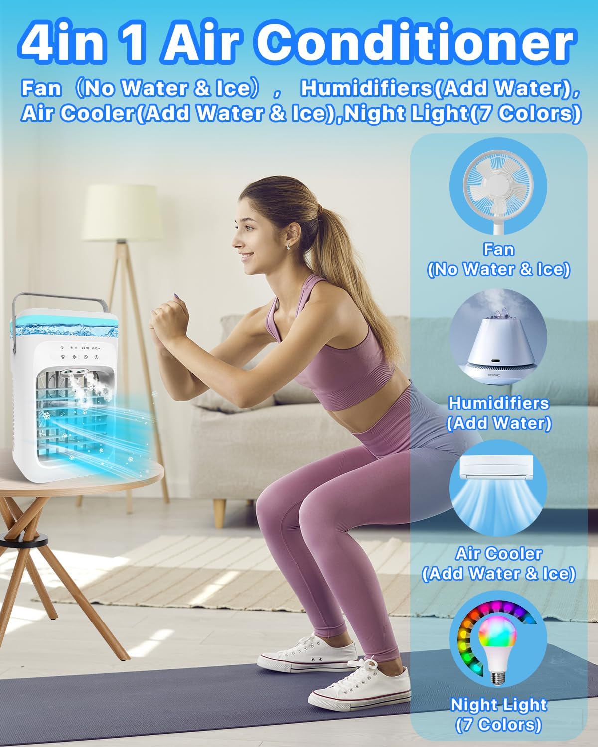 4-IN-1 Personal AC Unit- In the sweltering summer, do you want to cool off in every way? portable air cooler is your best choice. It’s not an ordinary cooling device. Instead, it combines a desktop fan, a mini air conditioner, a evaporative cooler, an air humidifier, and a 7 – color night light, creating an extraordinary comfortable experience for you