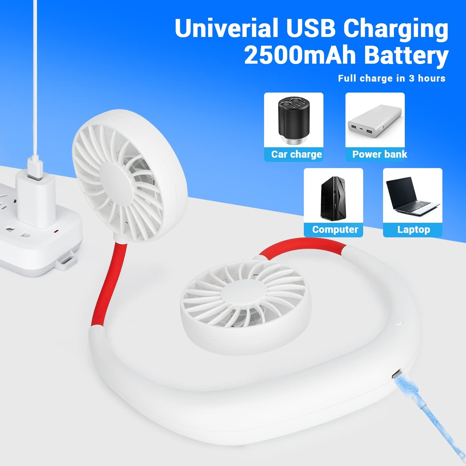 【USB Rechargeable Mini Fan】The neck fans has a built-in 2500mah lithium battery,which can be quickly charged through USB, and can work for 3-12 hours after a full charge, allowing you to enjoy a longer cool breeze in hot summer.Compatible with most computers, power banks,wall chargers,car chargers and other devices with USB output.