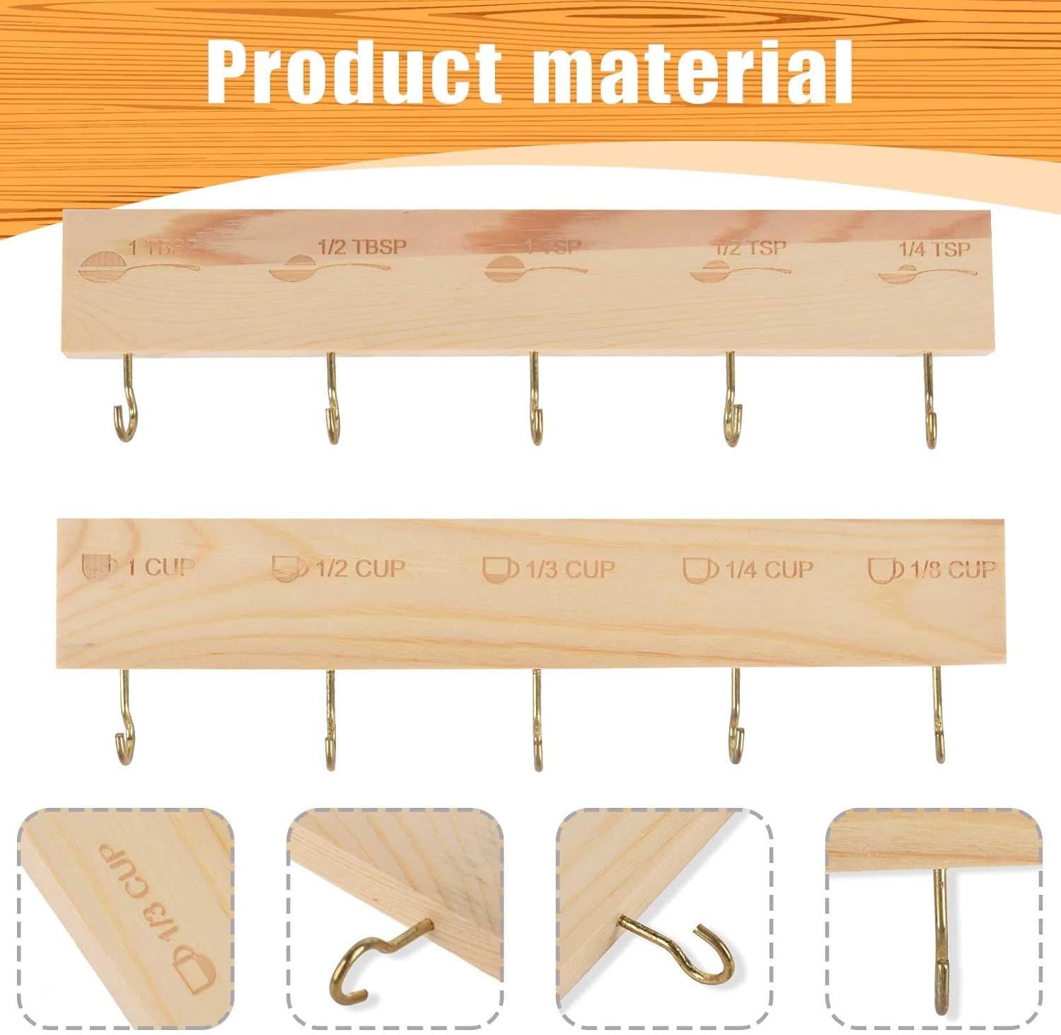 High quality material: measuring cup organizer uses high quality bamboo material, the material is hard, the arc of the hook can help you organize the kitchen utensils, the use of a long time, should not be damaged