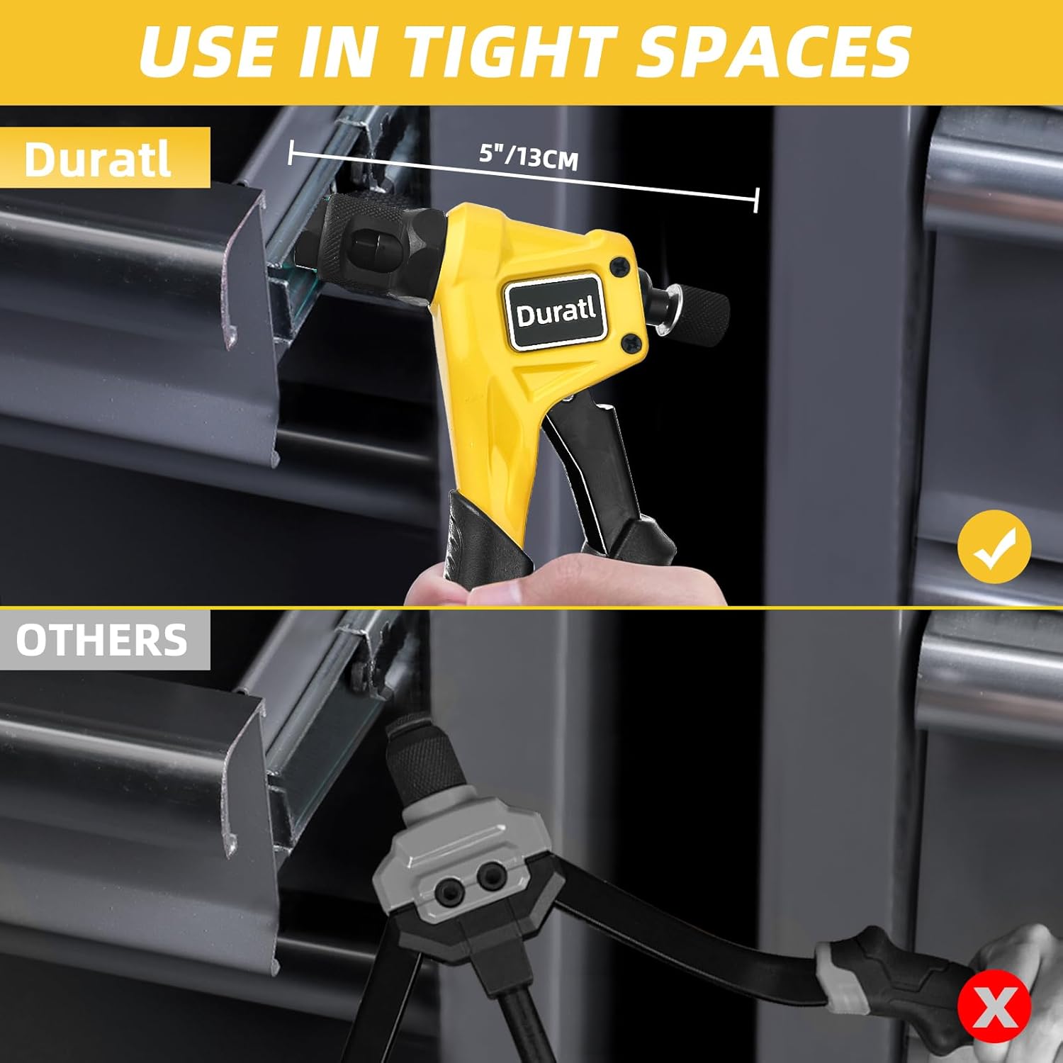 Compact Design for Easy Use in Tight Spaces: This 8-inch-long and 5-inch-wide Rivet nut tool is ideal for narrow-area work; It only requires a width greater than 5 inches for operation with this riv nut tool kit; Unlike some dual-handle rivnut gun tools needing a space wider than their length (e.g., 14″ or 16″ models), this nutsert tool easily adapts to confined workspaces, providing enhanced flexibility and efficiency in installations