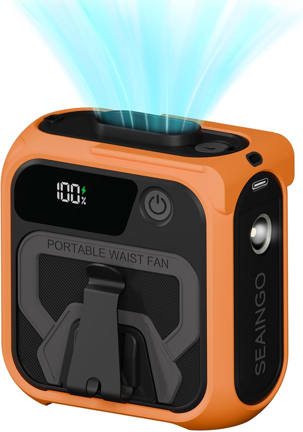 SEAINGO 5-in-1 Powerful Portable Fan: Waist fan, neck fan, desktop fan, handheld fan, and 10,000mAh power bank – all in one ultra-versatile device. Independent fan on switch and light control buttons keep operation simple for effortless all-day use, indoors or outdoors.
