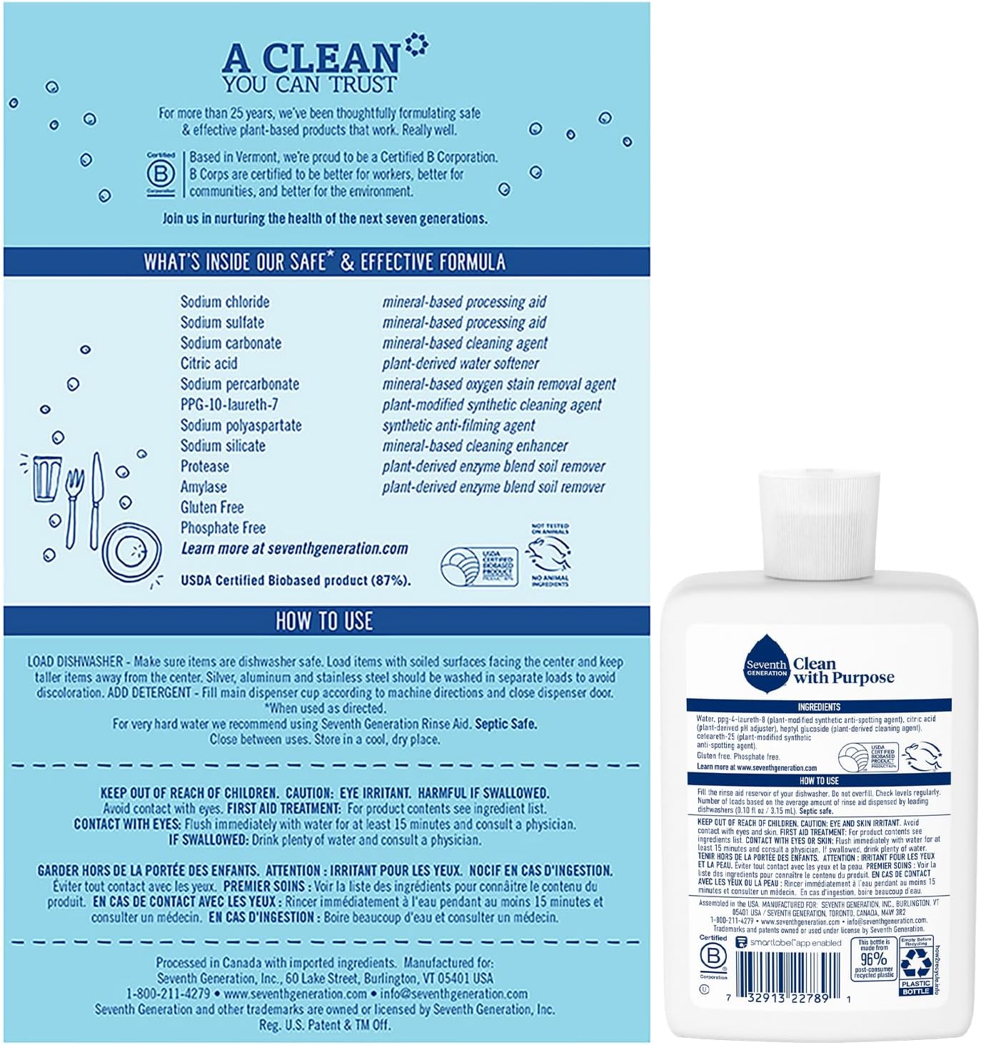 DISH DETERGENT POWDER & RINSE AID BUNDLE: Boost the naturally effective cleaning power of Seventh Generation Free & Clear Dishwasher Detergent Powder (45 oz) with our Power+ Rinse Aid (8 oz).