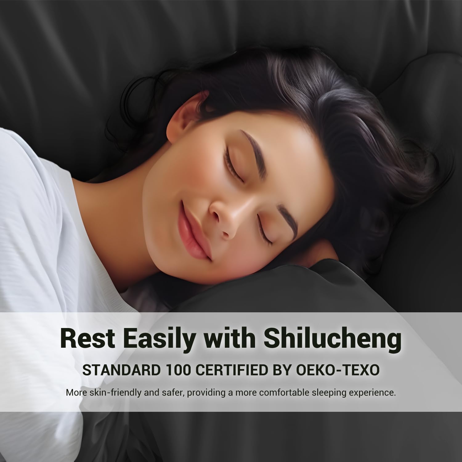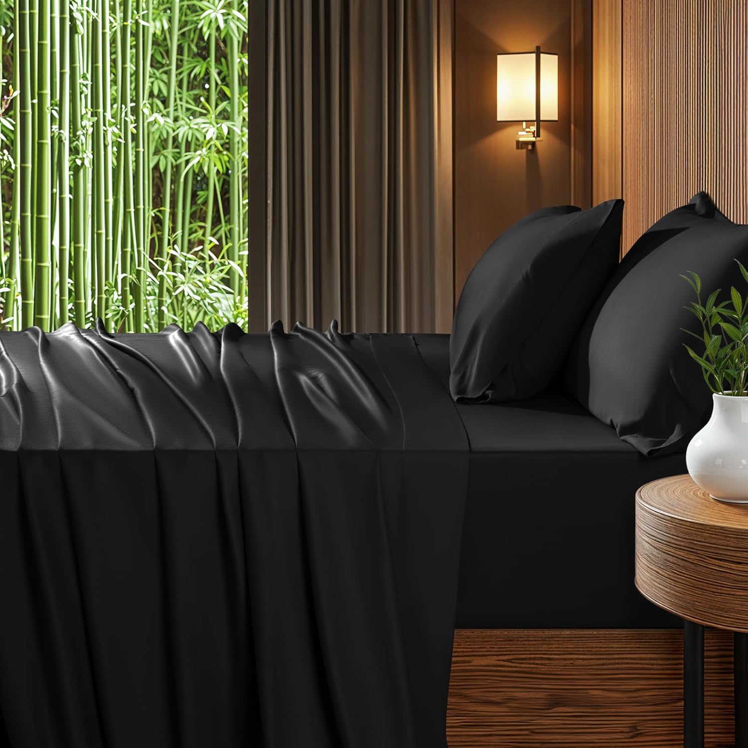Shilucheng Extra Deep Pocket King Sheets, Blend Rayon Derived from Bamboo_, Cooling & Breathable Bed Sheets Fits 18″-24″ Thick Mattress, Hotel Silky Bedding Set, Black